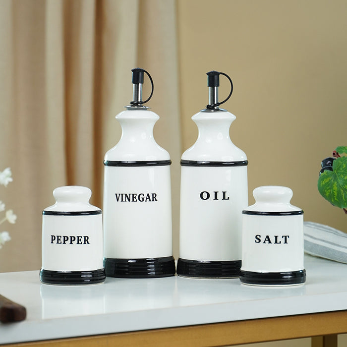 4-in-1 Set: Includes matching oil and vinegar bottles, plus salt and pepper shakers.