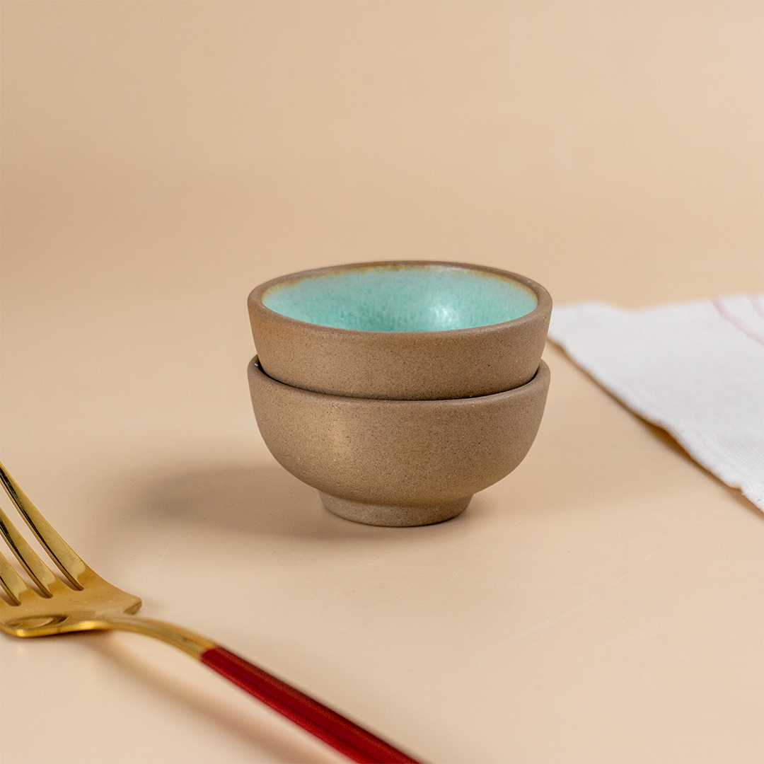 Elevate your table setting with this exquisite Artisanal Two-Tone Ceramic Dip Bowl Set. Featuring a striking contrast between a raw, earthy exterior and a vibrant, glassy turquoise interior, these bowls blend rustic charm with modern elegance, making even the simplest condiments look gourmet.