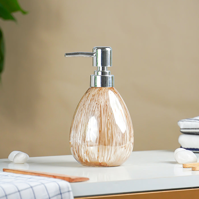 Upgrade your bathroom or kitchen with this stunning beige streaked glass soap dispenser. Designed with a teardrop shape, its glossy finish and delicate brown streaks mimic natural brush strokes, giving it a distinctive and artistic appeal. The chrome pump adds a sleek, modern touch, making this dispenser a refined addition to any space. Ideal for holding liquid soap, lotion, or hand sanitizer, this dispenser offers both beauty and practicality.