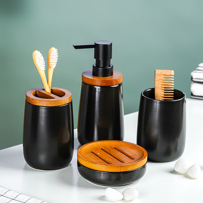 Upgrade your bathroom with this black ceramic bathroom set, featuring a sleek matte finish and warm bamboo accents. This 4-piece collection includes a soap dispenser, two toothbrush holders, and a soap dish with a slatted bamboo lid for optimal drainage. Designed for a contemporary and minimalist aesthetic, this set blends effortlessly with modern, industrial, or Scandinavian-inspired interiors.