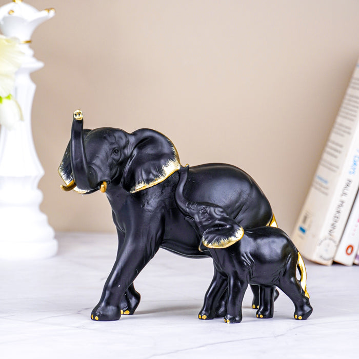 Celebrate the bond of family with this stunning black elephant figurine set, featuring a mother and calf adorned with shimmering gold accents. This intricately designed sculpture captures the grace and strength of elephants, symbolizing wisdom, loyalty, and protection. Perfect for enhancing your living room, office, or entryway, this figurine set brings cultural significance and artistic beauty to your decor.