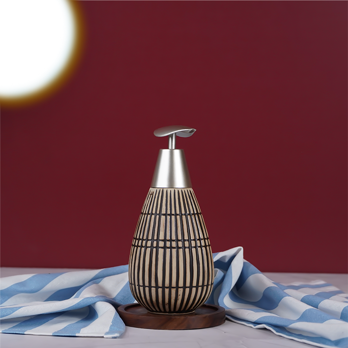 Elevate your bathroom decor with this stunning Black Striped Ceramic Soap Dispenser. The elegant design features bold black stripes on a cream-colored base, creating a visually appealing contrast that fits perfectly in any modern bathroom. The high-quality ceramic material ensures durability, while the sleek silver pump adds a touch of sophistication.