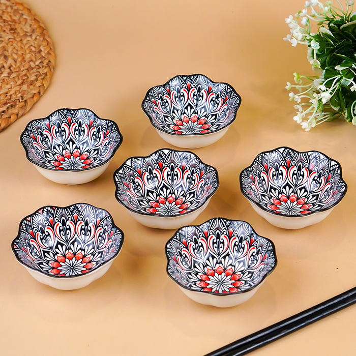 Enhance your dining experience with this set of 6 Black & White Scallop-Edge Ceramic Bowls, featuring a beautifully detailed floral pattern. The hand-painted black and white design is both intricate and elegant, creating a timeless look. The scalloped edges add a decorative touch, making these bowls as stylish as they are functional.