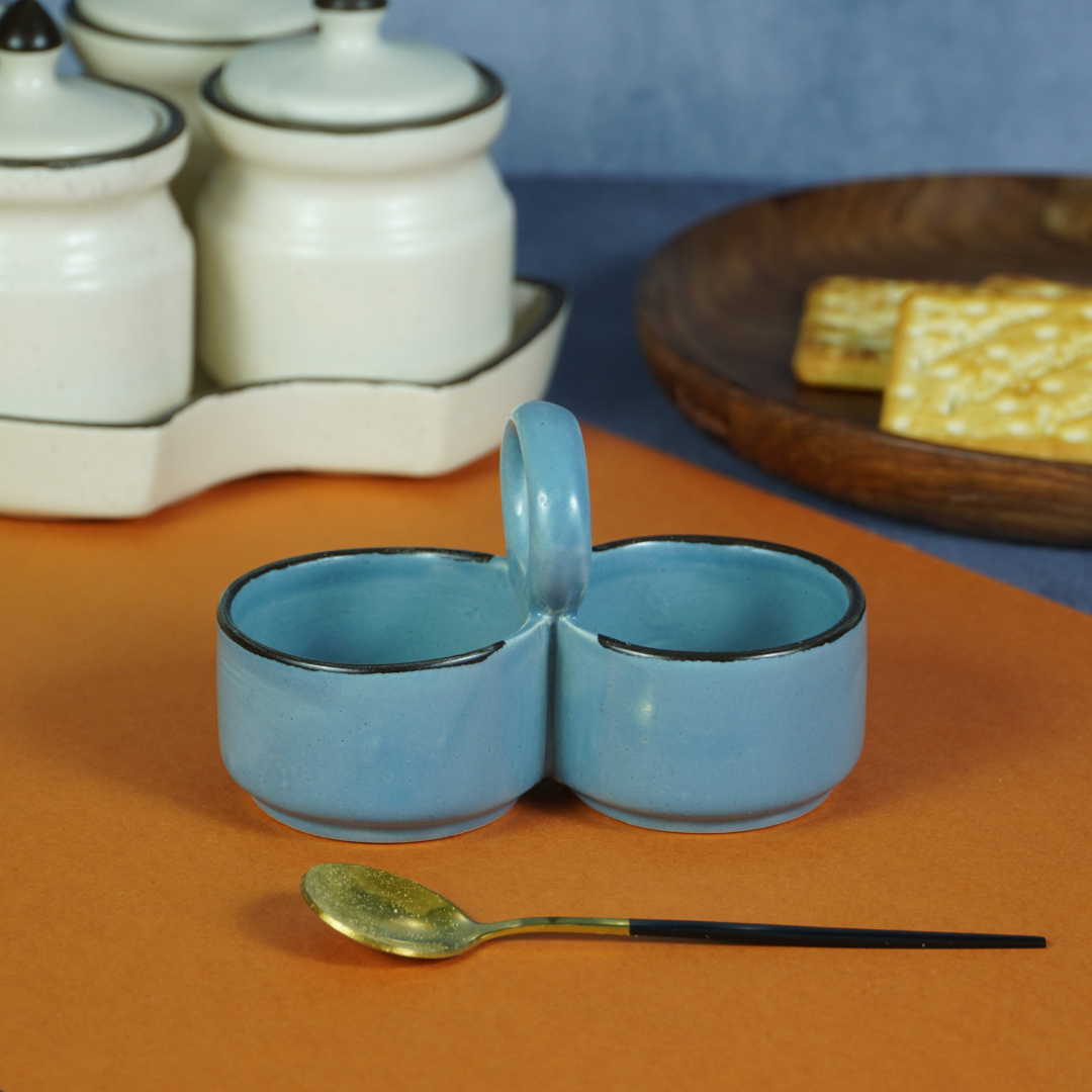 Crafted from high-quality ceramic, the bowl boasts a sleek and smooth surface finished in a serene blue glaze. The blue color adds a touch of elegance and tranquility to your kitchen decor, while the ceramic material ensures durability and ease of maintenance. Whether placed on your dining table or kitchen counter, this salt and pepper bowl adds a stylish and functional touch to your culinary experience.