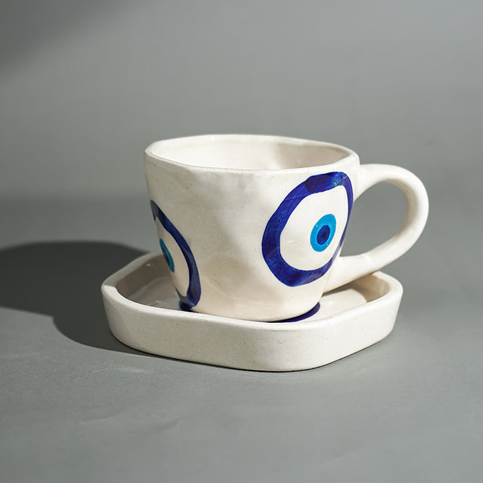 Add a protective charm to your coffee break with this White Cup & Saucer Set featuring a hand-painted blue Evil Eye design. Inspired by Mediterranean symbolism, the bold blue concentric circles bring both character and cultural depth to your daily rituals. Each set is uniquely crafted, making every piece one of a kind.