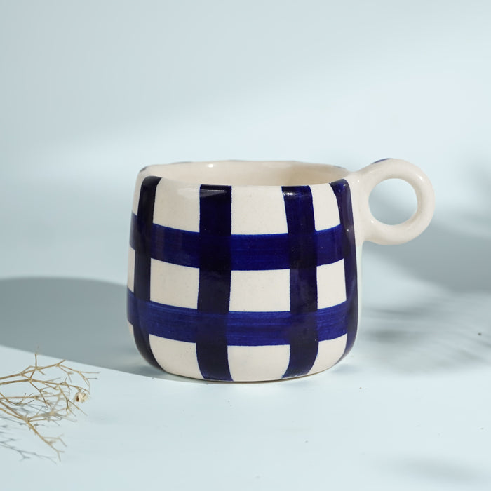 Bring a touch of artisanal charm to your kitchen with this set of two handcrafted ceramic mugs. Featuring a bold blue and white checkered design, these mugs are both visually striking and highly functional. The unique loop handles offer a comfortable grip, while the sturdy ceramic construction ensures durability for daily use. Perfect for coffee, tea, or hot chocolate, these mugs combine style and utility, making them an excellent choice for home or gifting.