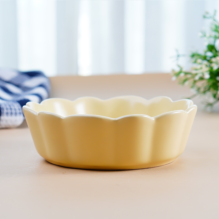 Add a splash of cheerful color to your table with this butter yellow ceramic bowl. The small size and scalloped edges offer a playful yet sophisticated twist, perfect for individual servings or decorative purposes. Its bright, inviting color enhances any meal or decor theme.