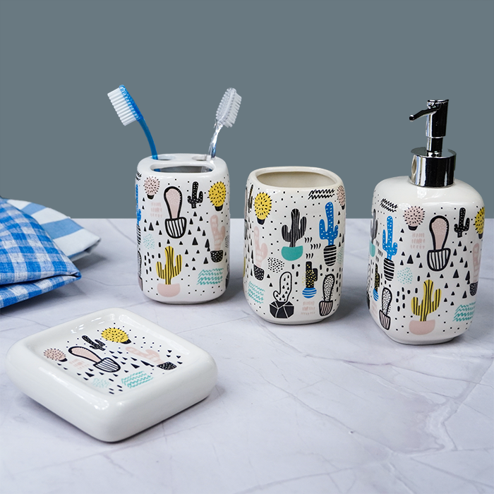 Imagine starting your day with a burst of color as you reach for your toothbrush from the modern cactus-themed holder or pump soap from the equally stylish dispenser. This set not only serves a practical purpose but also brings a lively and artistic touch to your everyday routine.
