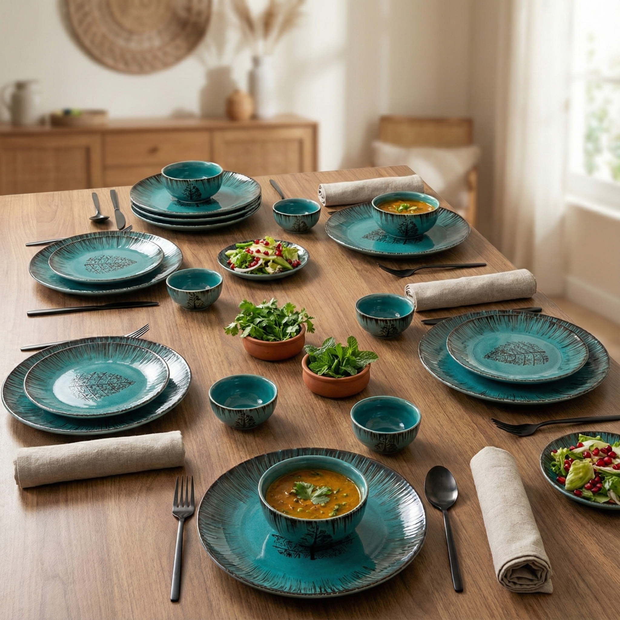 This teal ceramic dinnerware set combines artistry and functionality, making it ideal for those who want to bring a creative touch to their dining table. The black tree motif adds a sophisticated yet earthy vibe, making this set a perfect addition to both modern and rustic home decor styles. Whether for casual meals or special occasions, this set makes every meal feel extraordinary.