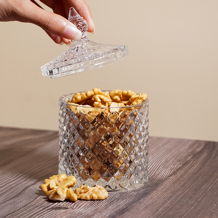 Lifestyle Integration: Picture this crystal-cut glass jar sitting on your kitchen counter, filled with your favorite snacks, ready for a quick grab during a busy day. Its classic design makes it versatile enough to blend with both traditional and modern kitchen decor. Whether you're entertaining guests or simply want to add a touch of elegance to your everyday routine, this jar offers both style and practicality, making it a must-have for any home.