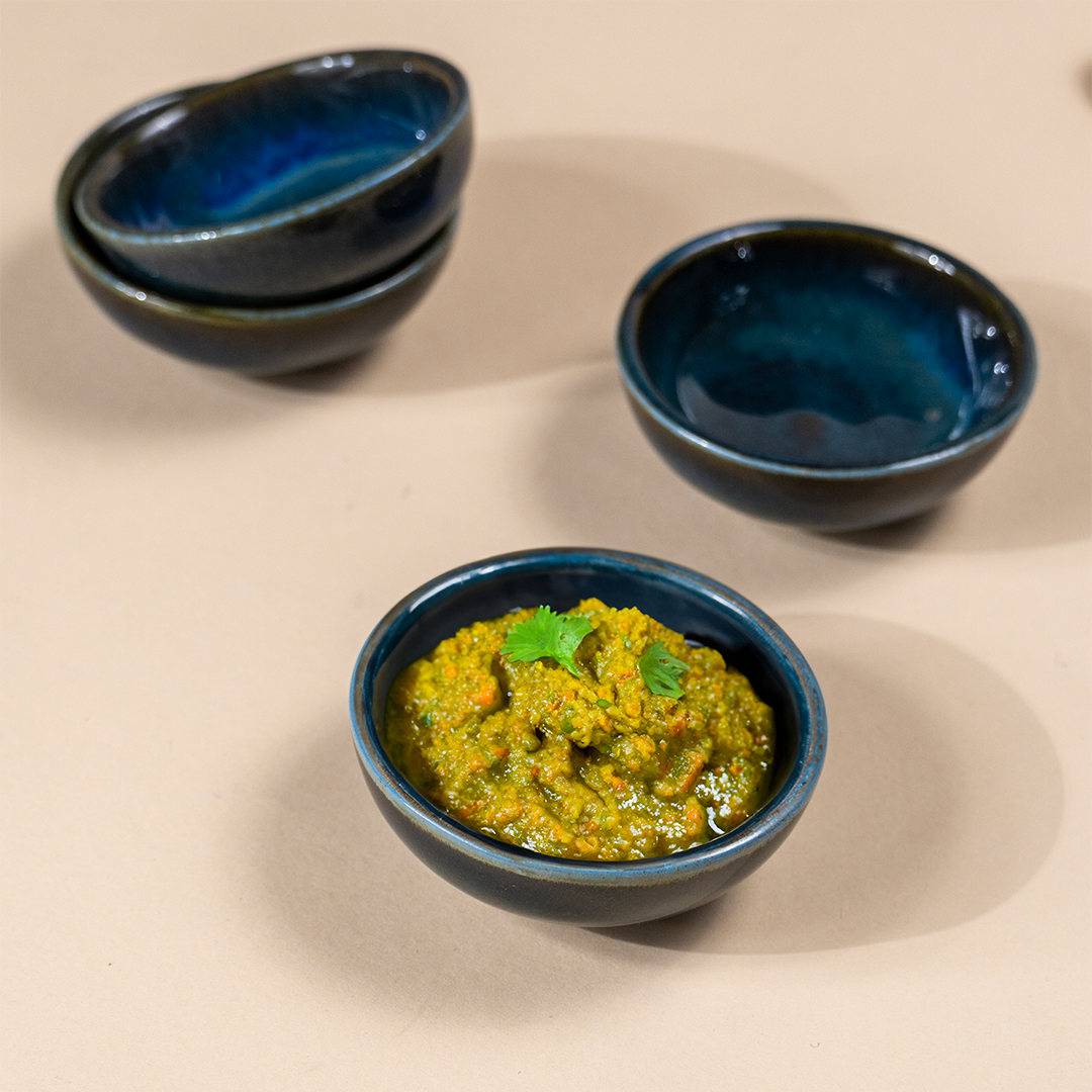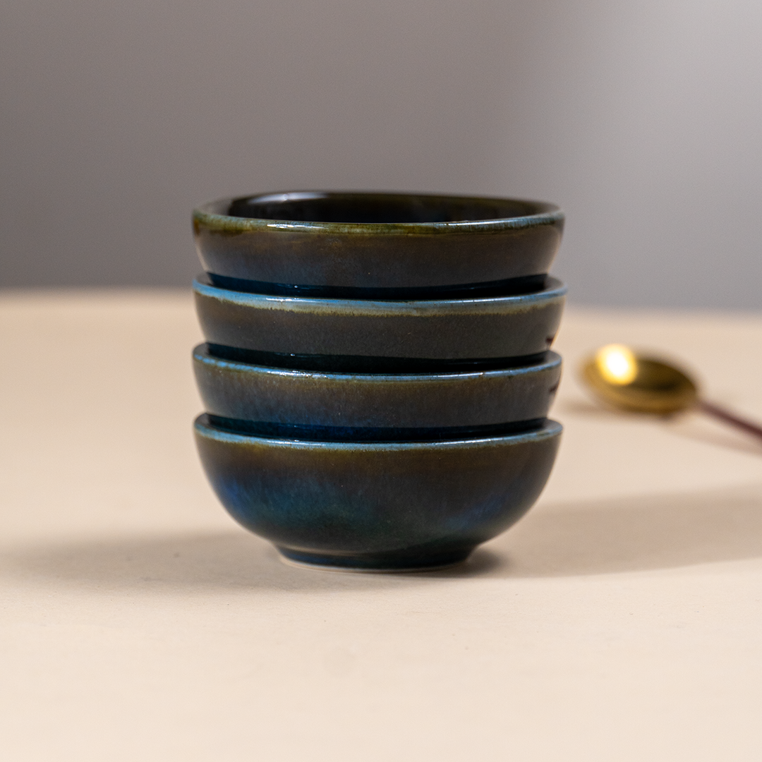 Capture the beauty of the deep sea with this captivating set of Artisan Dark Blue Glazed Dipping Bowls. Featuring a unique, reactive glaze, each bowl displays an intense mix of midnight blue, sapphire, and dark navy, often with subtle, rustic brown or black tones around the rim and base.