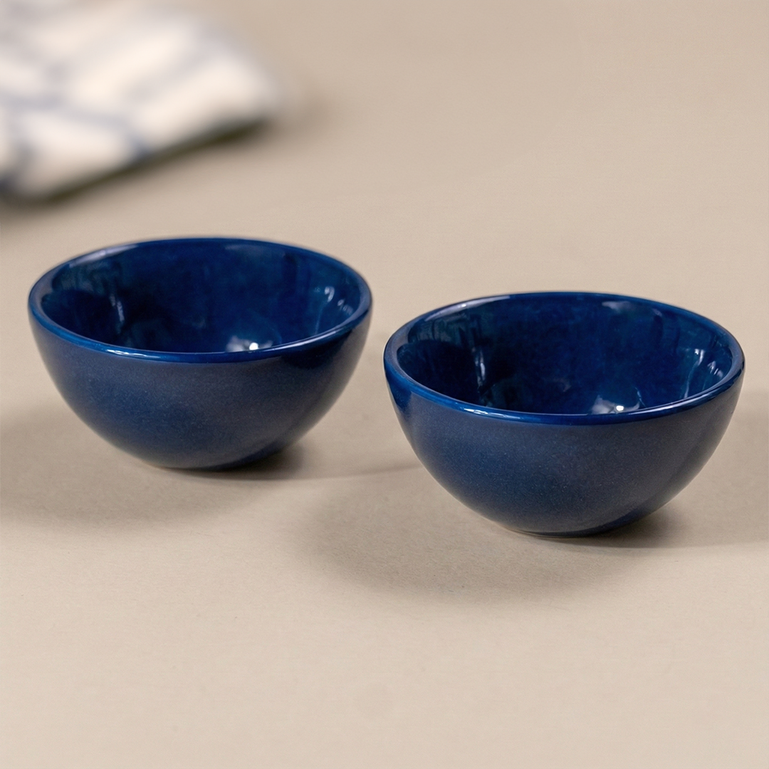 Make a striking statement on your table with this set of Deep Indigo Ceramic Dipping Bowls. The intense, rich color and high-gloss glaze give these simple, rounded bowls a touch of timeless elegance and depth.