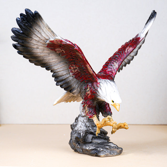 Capture the power and grace of nature with this striking bald eagle sculpture, showcasing vibrant red and brown feather detailing and a bold white head. The eagle is depicted in mid-flight with its talons extended, perched on a rocky base that enhances the realism of the design. Perfect for nature lovers and art enthusiasts, this piece makes a stunning centerpiece or decorative accent for your home or office.