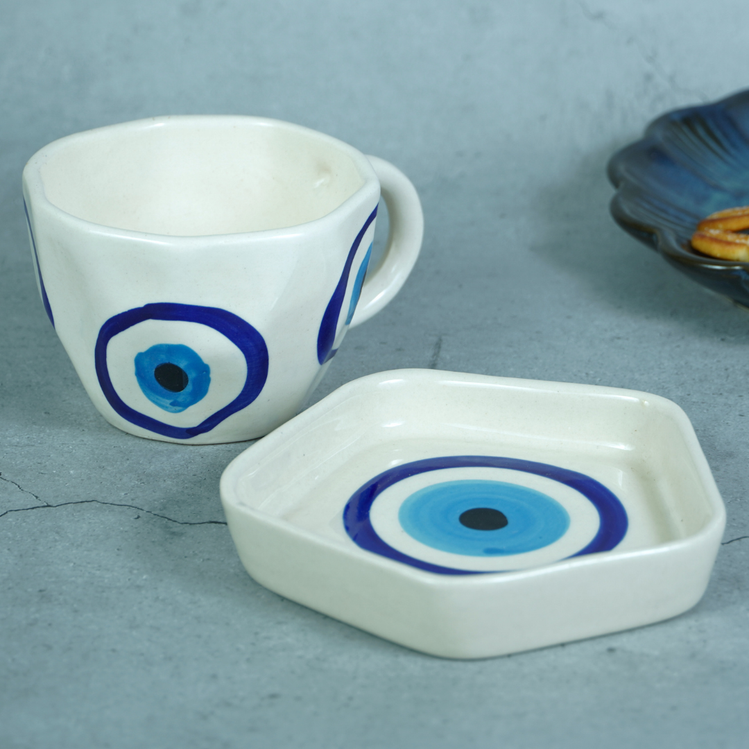 Introducing our Evil Eye Ceramic Cup and Saucer in a serene white color, a unique and stylish addition to your tableware collection. The Evil Eye Ceramic Cup and Saucer in white exude a sense of purity and simplicity. The cup is adorned with the iconic Evil Eye design, believed to bring protection and ward off negative energy, making it not only a stylish choice but also a symbol of positivity.