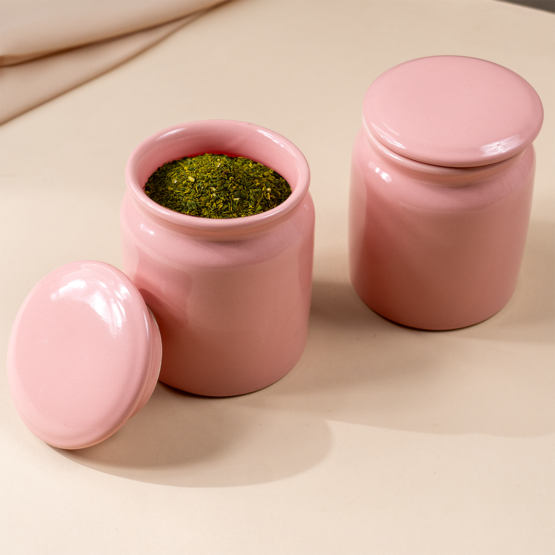 Add a touch of feminine charm and organization to your kitchen, counter, or vanity with this beautiful Set of 2 Glazed Pink Ceramic Canisters. Featuring a gentle, glossy finish, these jars offer both functional storage and delicate decoration.