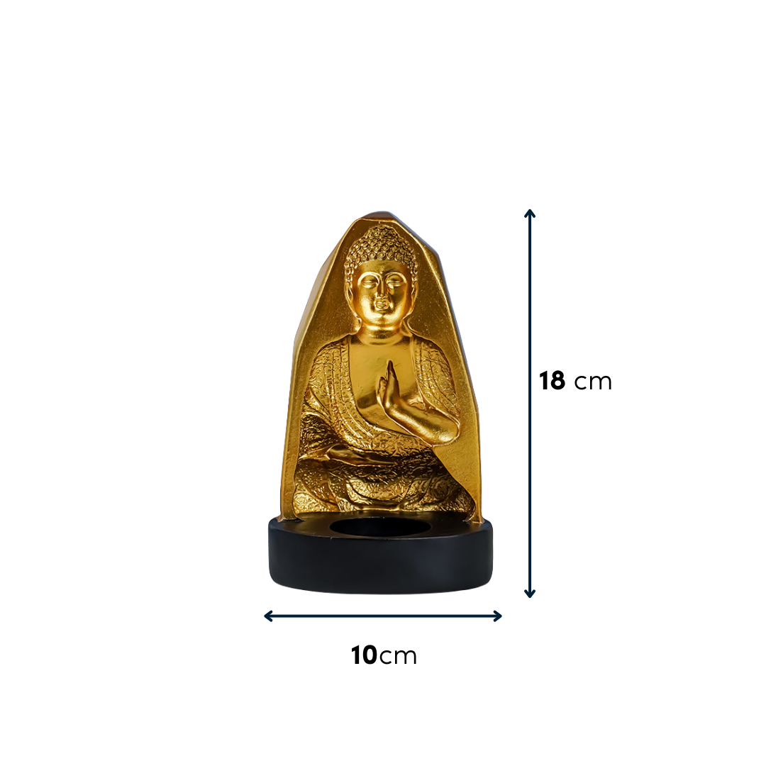 Create a serene and peaceful ambiance in your space with this gold Buddha incense holder, designed with a distinctive meditation aura structure. Crafted to reflect spiritual tranquility, this unique decor piece not only holds incense but also serves as a symbol of wisdom and mindfulness. The lustrous gold finish enhances the intricate details of the Buddha figure, while the sturdy black base provides stability. Whether placed in a meditation room, living space, or office, it radiates a sense of calm and positivity.