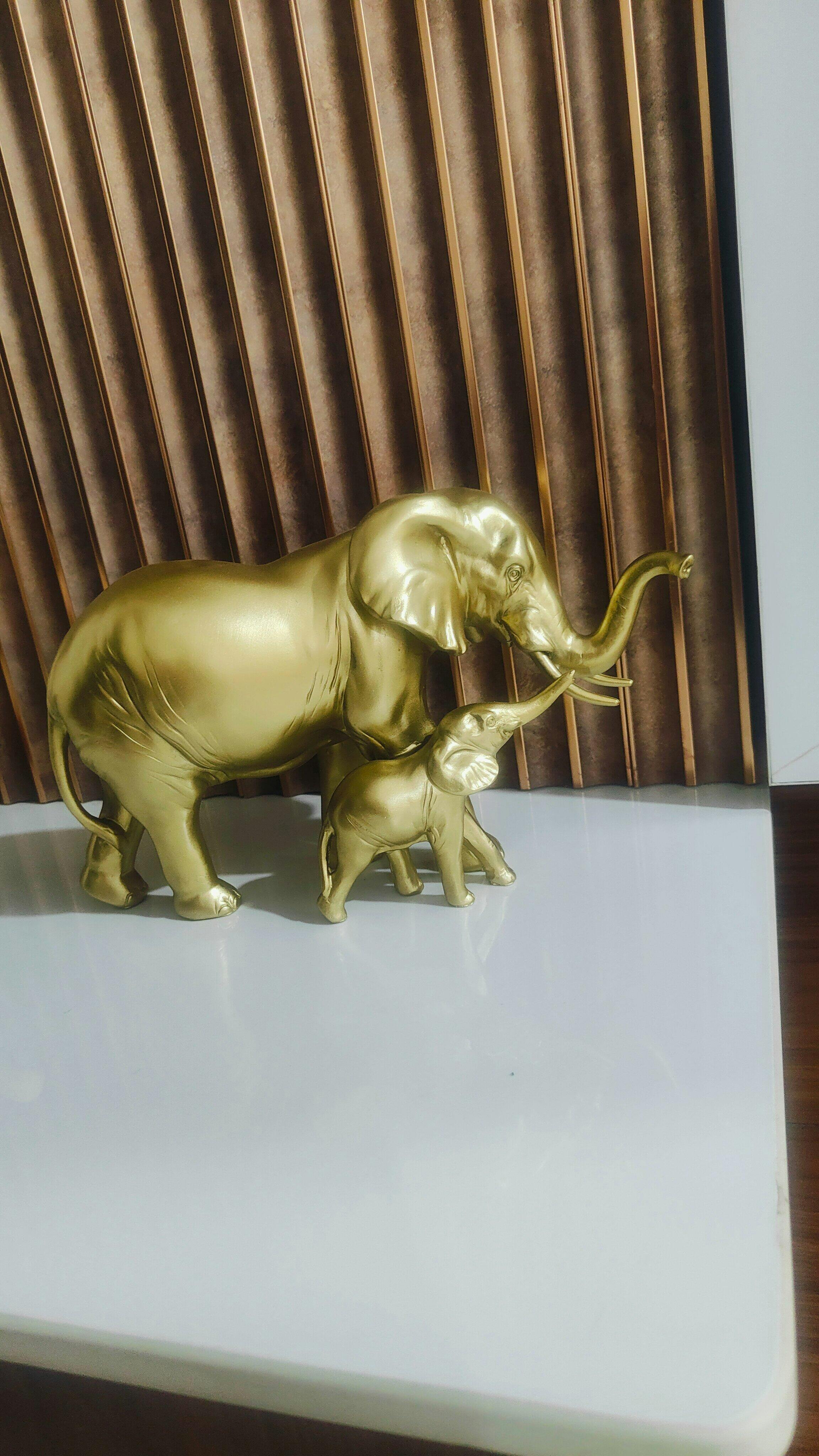 Celebrate the bond of family and prosperity with this gold elephant and calf statue, featuring beautifully detailed craftsmanship and symbolic trunk-up poses. Representing good fortune, wisdom, and nurturing care, this decorative piece brings positive energy and elegance to any space. The smooth gold finish enhances its visual appeal, making it an ideal addition to modern or traditional interiors.