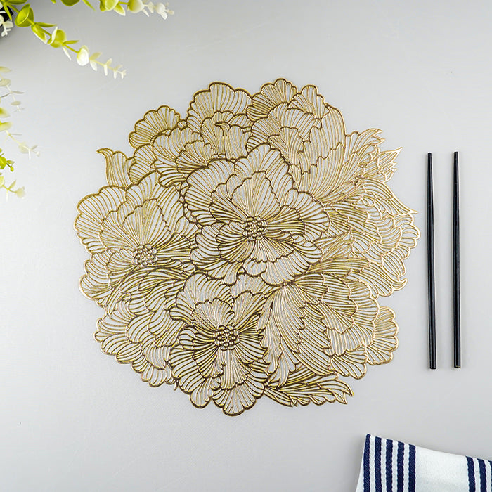 Add a touch of sophistication to your dining space with this gold floral cutout table mat, intricately designed with a peony-inspired pattern. Featuring fine detailing and a durable material, this table mat not only protects your surfaces but also serves as a statement décor piece. The openwork floral design enhances the beauty of your table while allowing the surface underneath to subtly show through, creating an elegant layered effect.