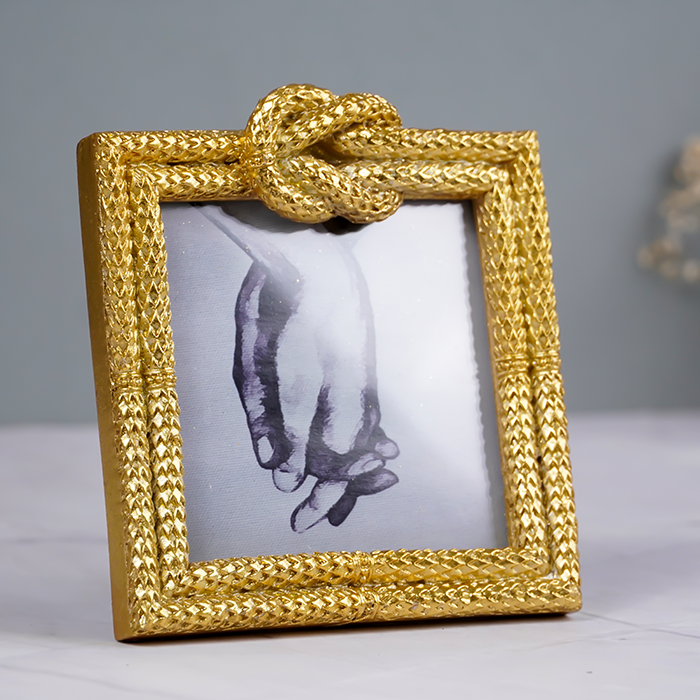 Lifestyle Integration: Imagine this Gold Textured Photo Frame with Knot Detail gracing your living room or office, adding a touch of luxury and refinement. Its unique design makes it a perfect complement to both modern and classic decor styles, providing a beautiful way to showcase your favorite memories. Whether used to display a cherished family photo or an elegant piece of artwork, this frame seamlessly integrates into your home, enhancing its overall aesthetic appeal.
