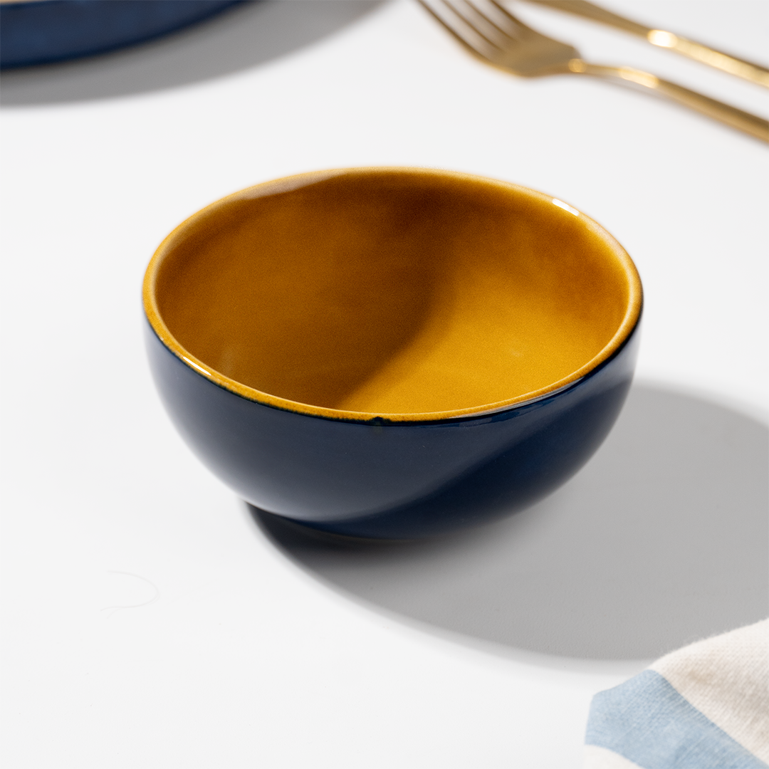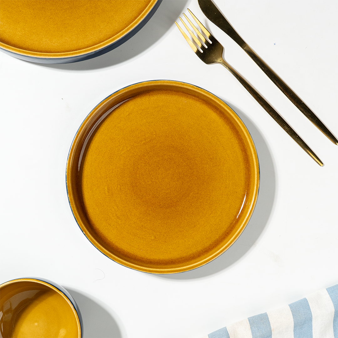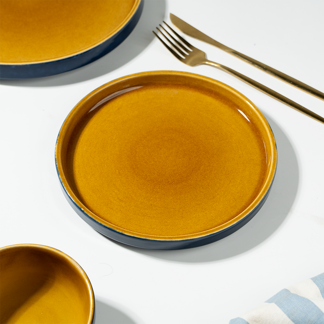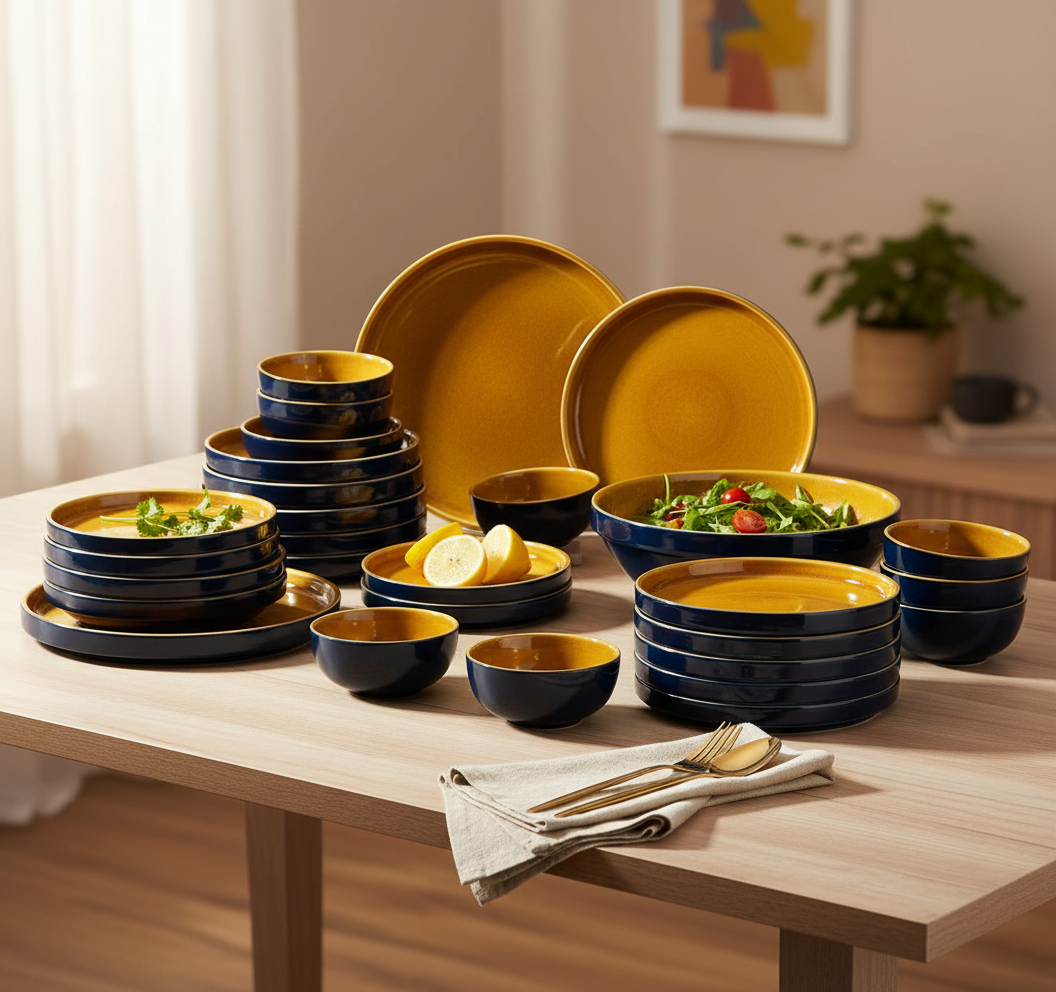 Upgrade your dining experience with this 18-Piece Ceramic Dinner Set for 6, designed in a striking golden mustard interior with a rich navy blue exterior. The dual-tone glazed finish adds a bold, modern look, making it perfect for both everyday meals and special occasions.