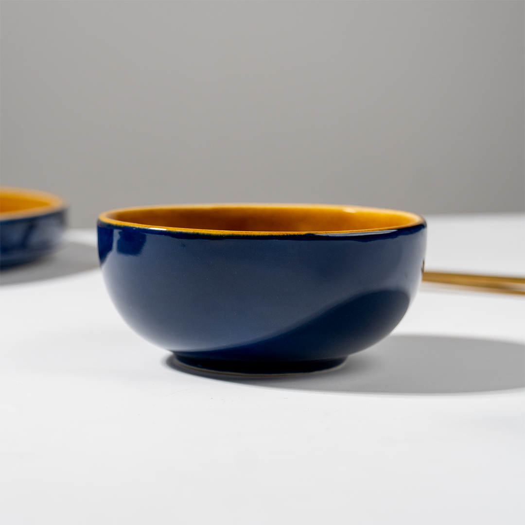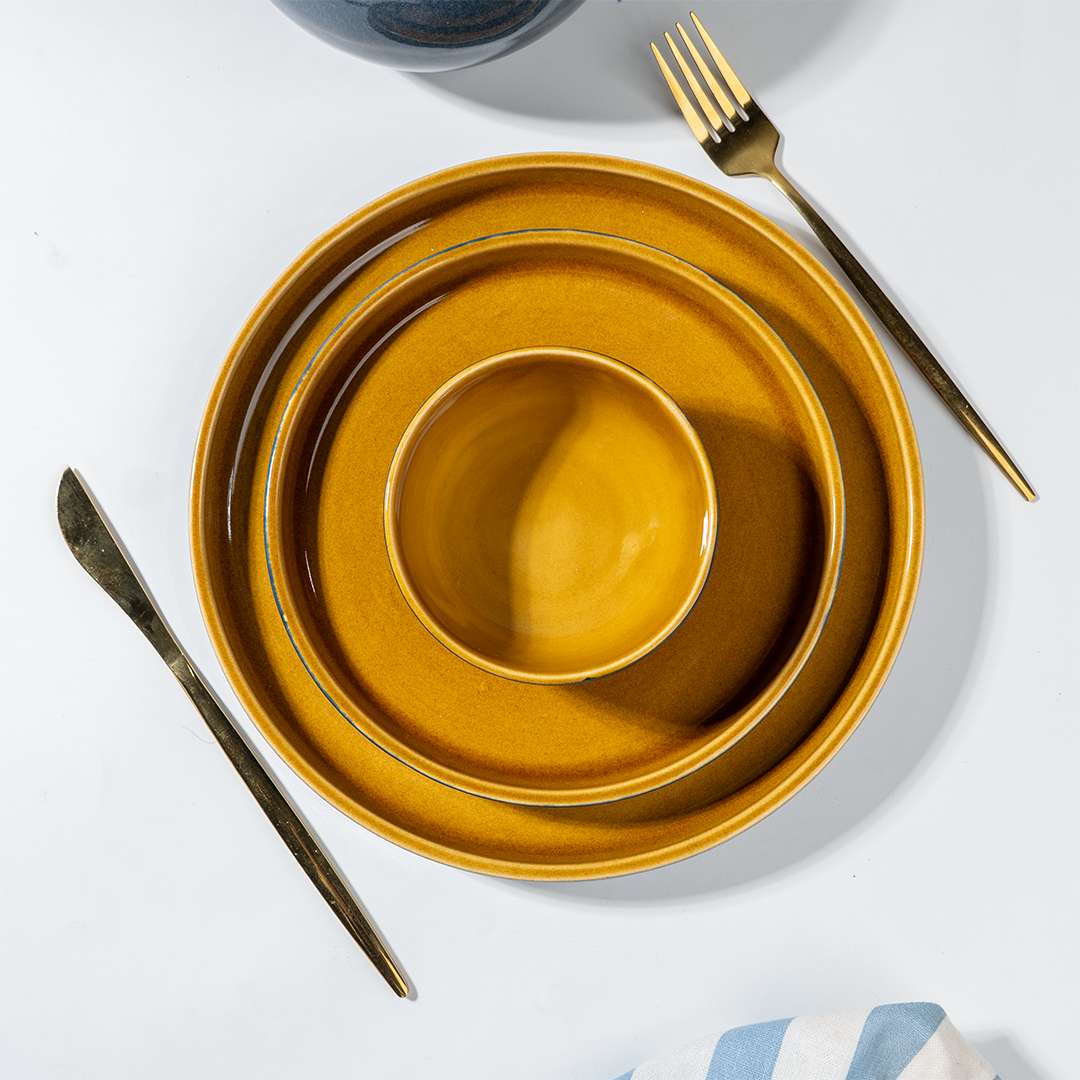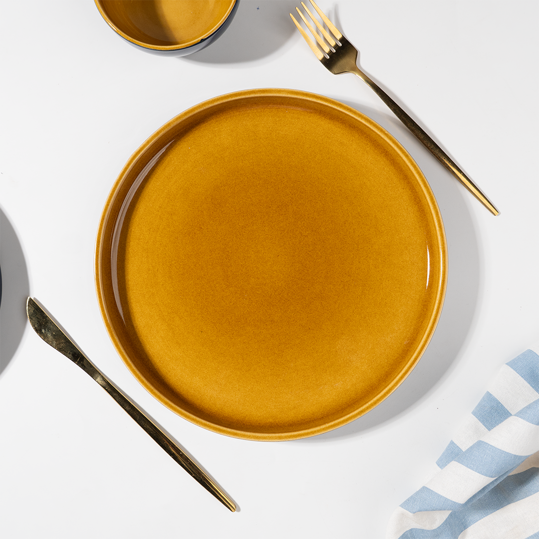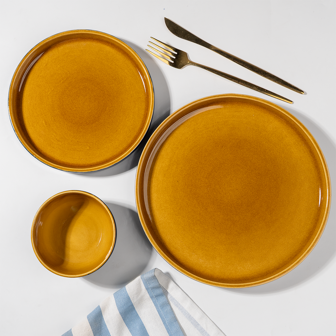 Upgrade your dining experience with this 18-Piece Ceramic Dinner Set for 6, designed in a striking golden mustard interior with a rich navy blue exterior. The dual-tone glazed finish adds a bold, modern look, making it perfect for both everyday meals and special occasions.