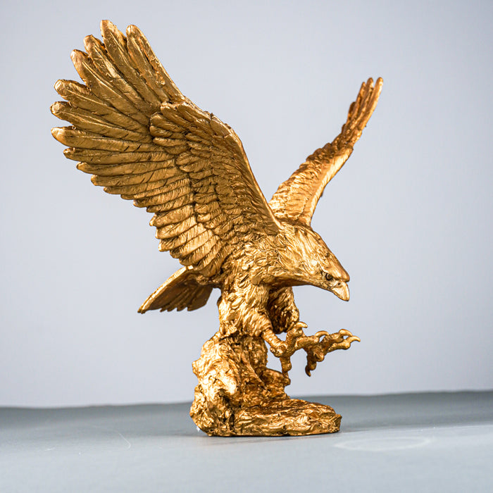 Capture the essence of freedom and strength with this golden eagle figurine, showcasing a highly detailed wingspan in mid-flight. This stunning sculpture represents power and grace, making it an ideal decor piece for your home or office. The shimmering gold finish enhances its bold design, while the intricate craftsmanship makes it a striking focal point in any setting.
