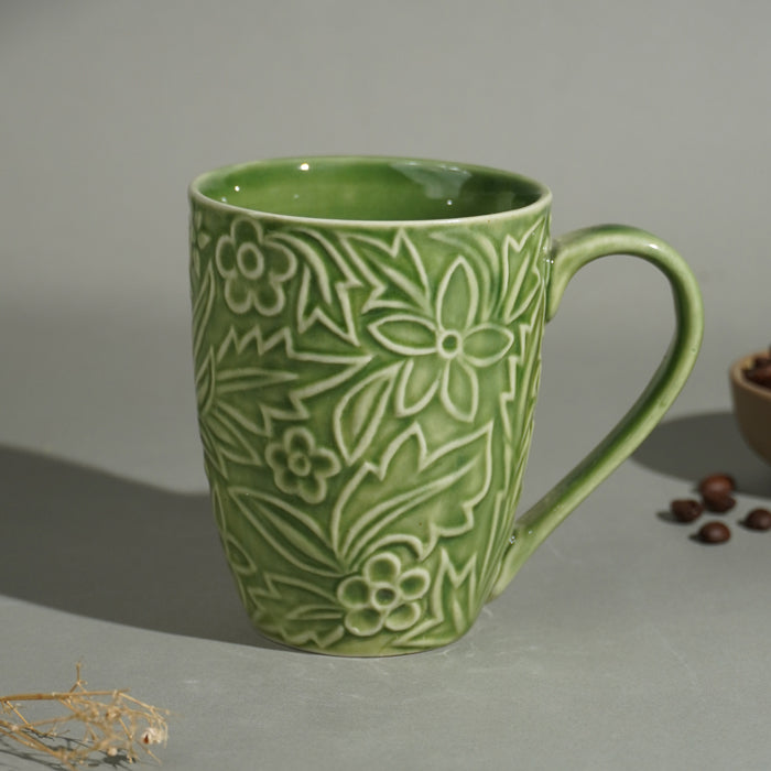 Start your day with this vibrant green ceramic mug, featuring an intricately embossed floral and leaf pattern. Its nature-inspired design adds a fresh and cheerful touch to your coffee or tea time. Made from high-quality ceramic, this mug is as durable as it is visually appealing, making it perfect for daily use or as a statement piece for your kitchenware collection.