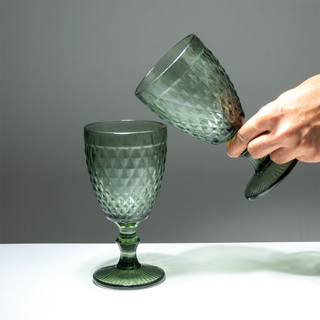 Bring a refreshing vintage elegance to your table with this 6-piece set of green textured glass goblets. These goblets are crafted from high-quality pressed glass with an embossed diamond or lattice pattern, giving each one a delicate yet sturdy feel. Their stemmed design and soft emerald green hue make them perfect for everything from water and wine to cocktails and mocktails. Whether you’re hosting a dinner party or just want to elevate everyday dining, these goblets infuse color and sophistication into every sip.
