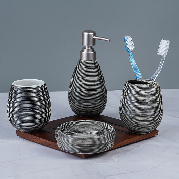 Imagine starting your day with a sense of sophistication as you reach for your toothbrush from the elegant striped holder or pump soap from the sleek dispenser. This set not only serves a practical purpose but also brings a refined and modern touch to your everyday routine.