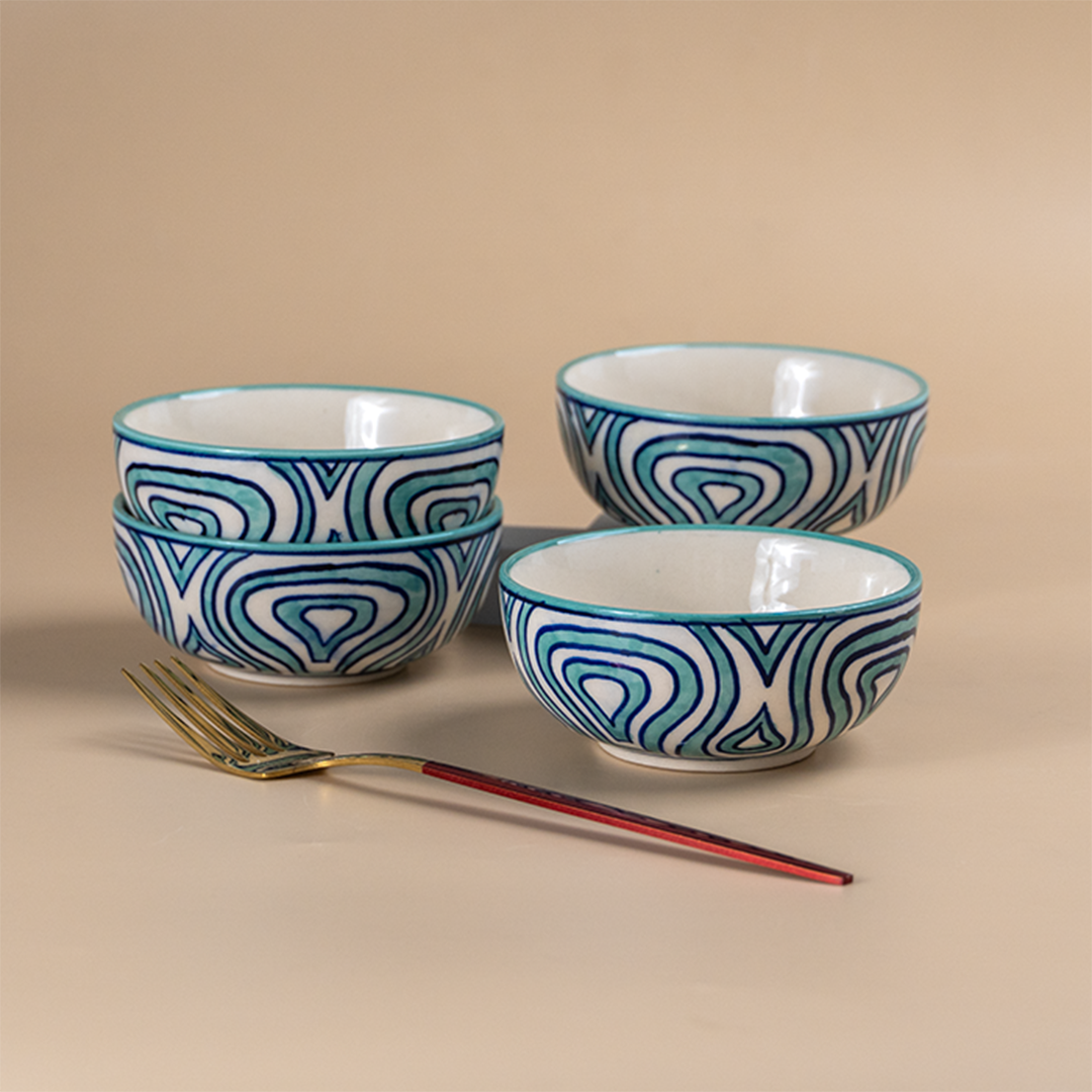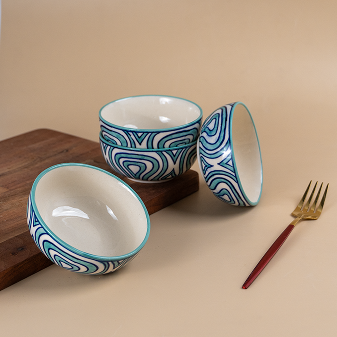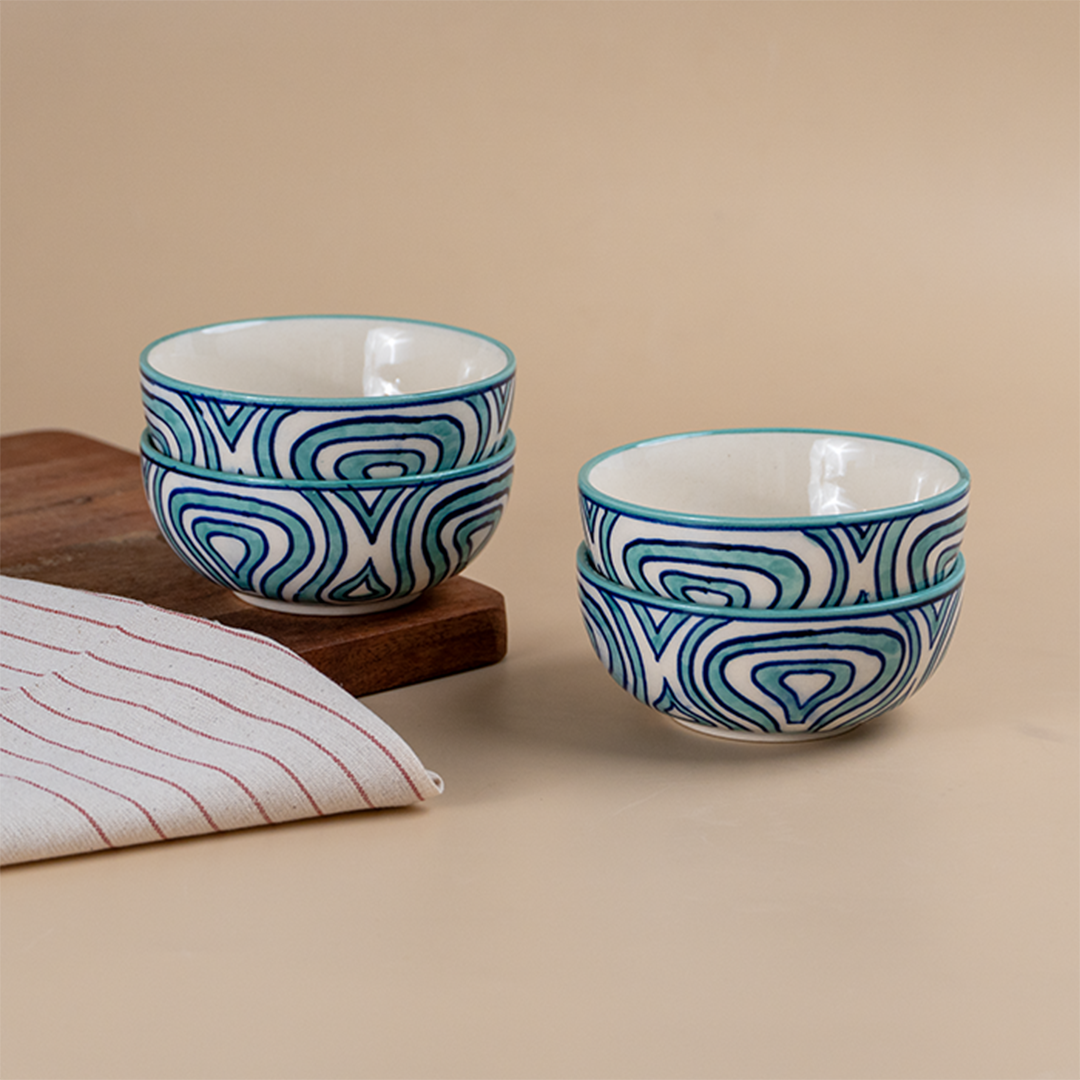 Bring an artisanal, handmade touch to your dining table with this set of 4 hand-painted blue geometric ceramic bowls. Each bowl is carefully crafted and decorated with a stunning swirl-pattern in soothing blue and teal tones — a design that strikes a balance between modern style and traditional craftsmanship. The creamy ceramic interior provides a clean, cozy backdrop for soups, salads, rice dishes, desserts, or snacks, while the exterior design makes each bowl a statement piece on its own.