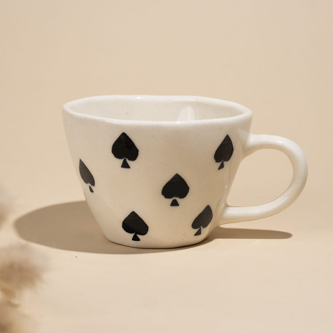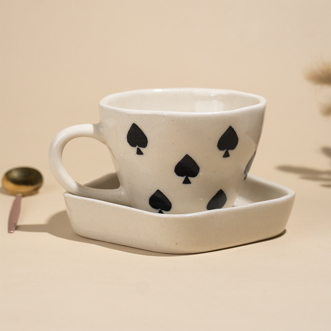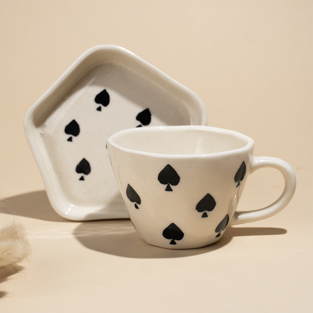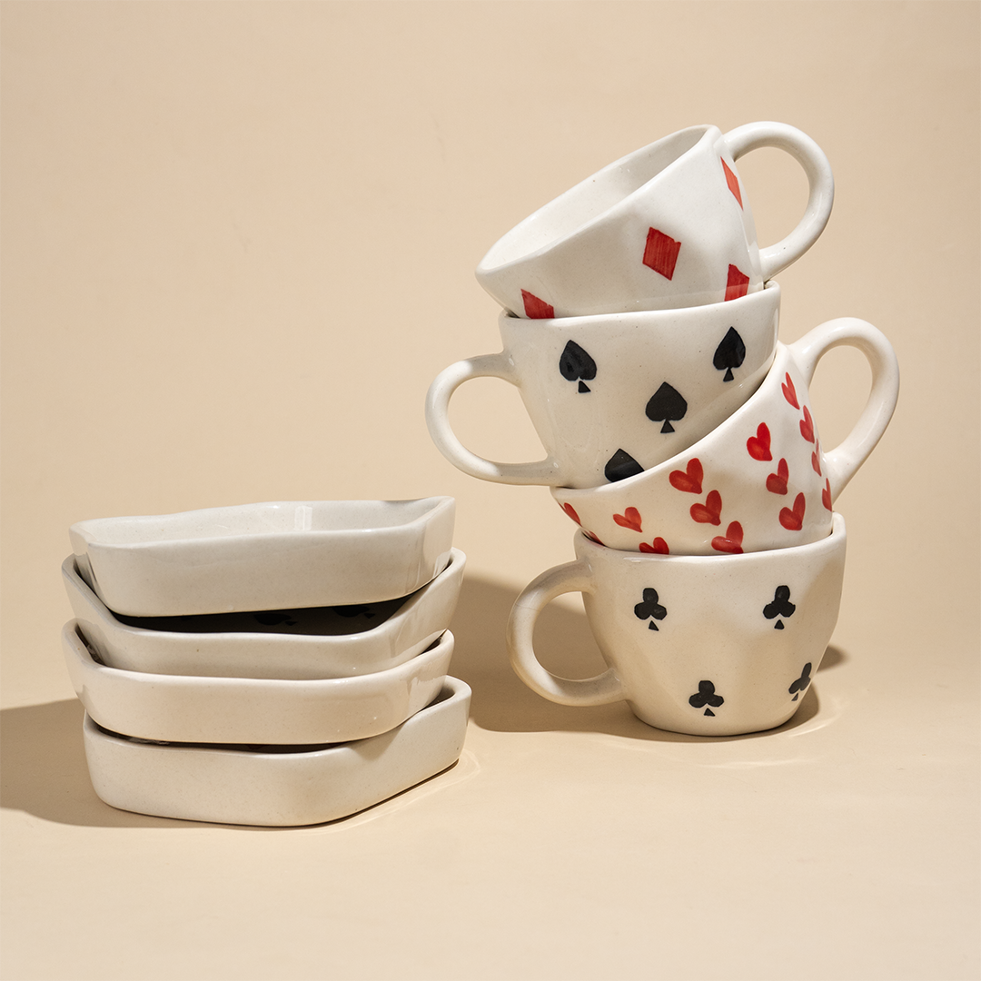 Bring fun and elegance to your tea or coffee moments with this handcrafted ceramic cup and saucer set of 4, inspired by the classic playing card suits — Heart, Diamond, Club, and Spade. Each cup features a unique hand-painted motif that adds a touch of creativity and charm to your serveware collection.