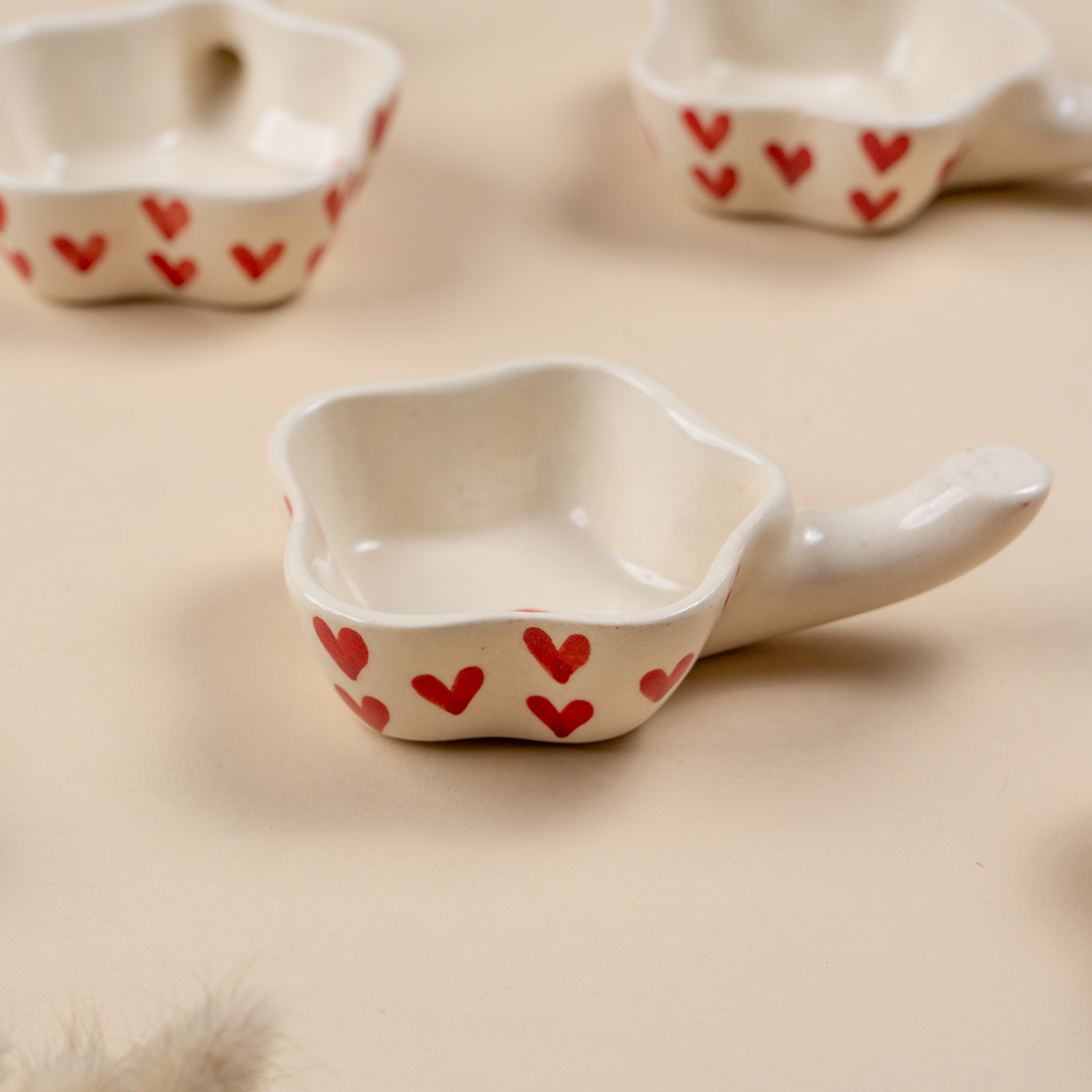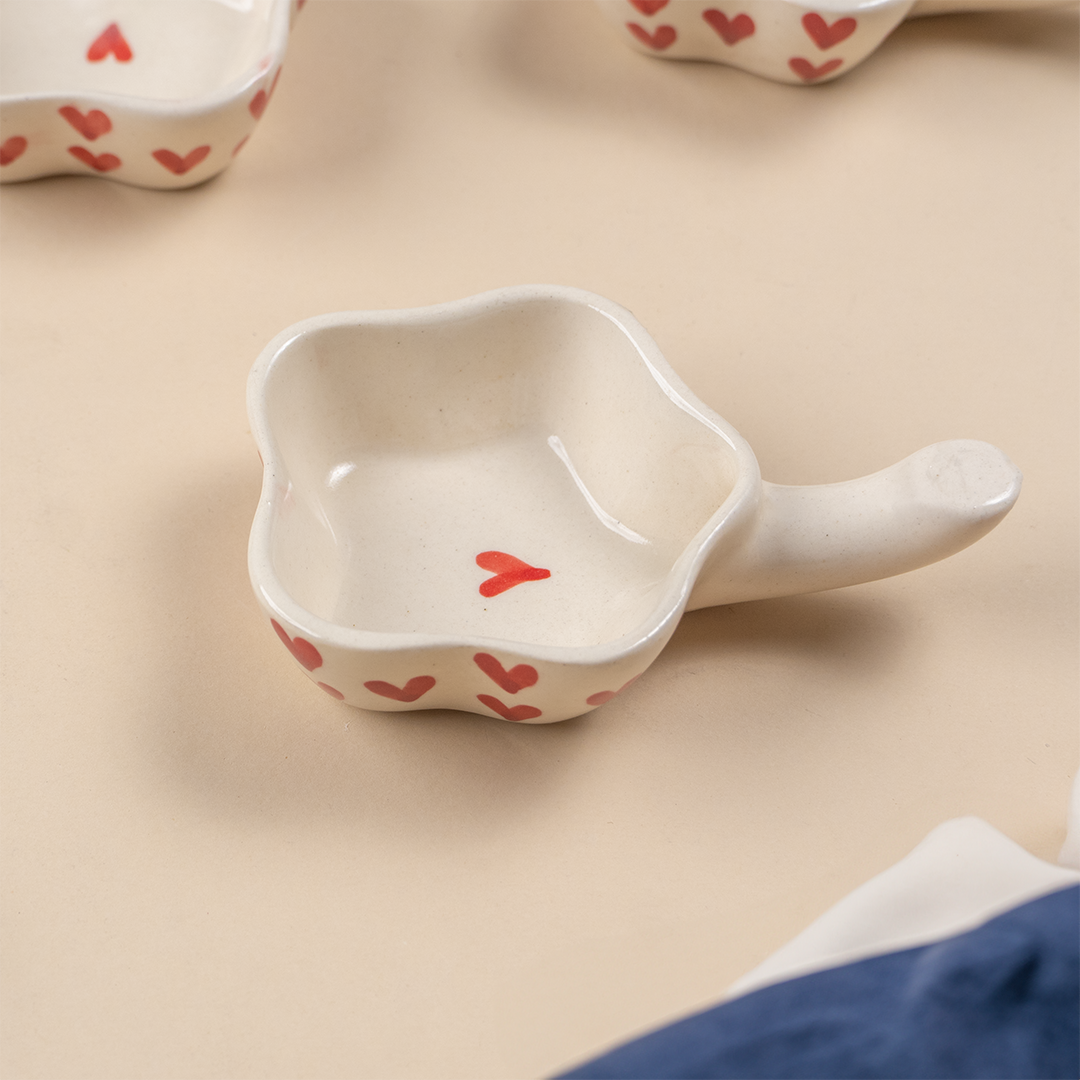 Serve your favorite sauces, chutneys, or condiments in style with this handcrafted ceramic dip bowl set, beautifully adorned with a charming red heart design. The soft cream base paired with delicate hand-painted red hearts adds a playful yet elegant touch to your dining table.