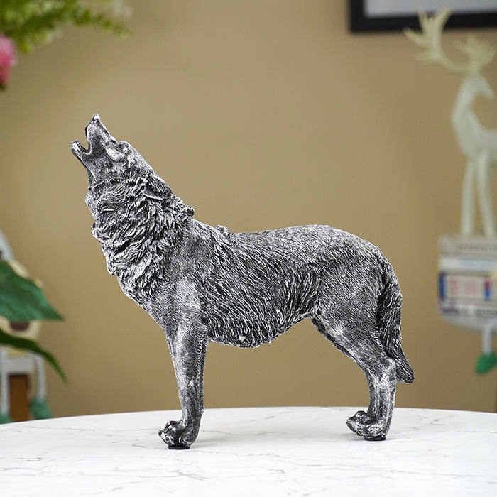 Bring the wild spirit of nature into your space with this howling wolf figurine, designed in a striking textured silver finish. The intricate detailing of the fur and lifelike posture captures the untamed beauty of the wolf, making it a captivating addition to your decor. Perfect for wildlife enthusiasts and rustic-themed interiors, this figurine embodies the call of the wild while adding a bold, artistic element to your home or office.