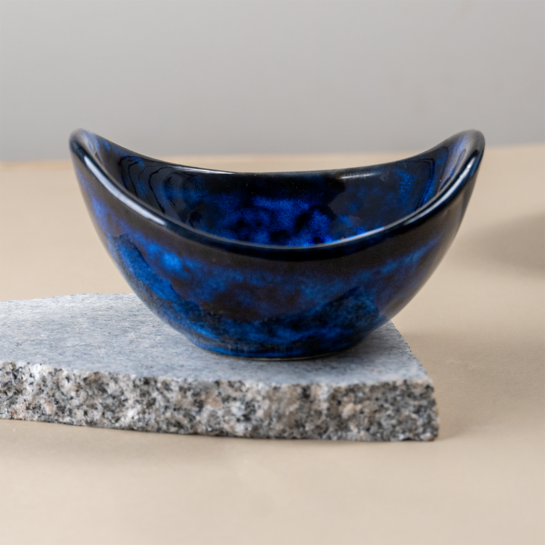 Our blue oval-shaped Kishti bowl set is a beautiful addition to any table setting. Made from high-quality materials, this set is both durable and elegant, making it perfect for everyday use and special occasions. The unique oval shape and vibrant blue color of these bowls make them a standout piece that is sure to impress your guests. Whether you're serving soups, salads, or desserts, this set is a must-have for any host or hostess looking to add a touch of sophistication to their dining experience. Its versatile design and stunning color make it perfect for both indoor and outdoor entertaining. Serve your favorite dishes in style with our blue oval-shaped Kishti bowl set.