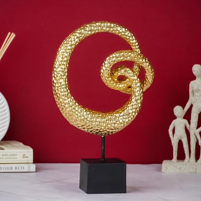 Make a bold statement with this Gold Spiral Loop Sculpture, designed with a hammered-texture finish and mounted on a sturdy black base. The abstract spiral form adds movement and dimension, making it an eye-catching accent for console tables, bookshelves, or office desks.