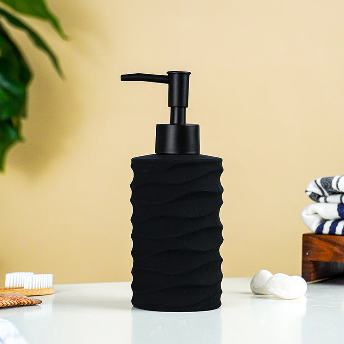 Elevate your bathroom or kitchen space with this matte black ripple ceramic soap dispenser. Designed with a sculpted wave texture, this dispenser creates a fluid, organic aesthetic that adds depth and sophistication. The matte black finish and matching pump provide a sleek, modern look, making it a standout piece in contemporary, industrial, or minimalist interiors.