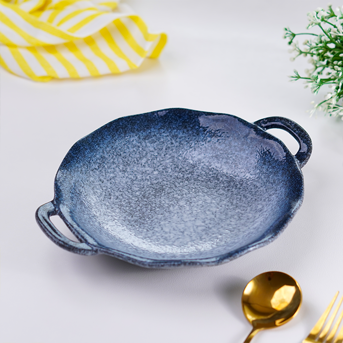 This matte blue ceramic bowl brings a touch of artisanal craftsmanship to your kitchen. Crafted from high-quality ceramic, the bowl showcases a striking deep blue finish with a lightly textured surface, perfect for both casual dining and formal settings. The unique dual-handle design not only adds an aesthetic edge but also ensures a comfortable grip for easy serving. Its versatile size makes it ideal for serving salads, soups, or pasta dishes, effortlessly blending with a wide range of table settings.