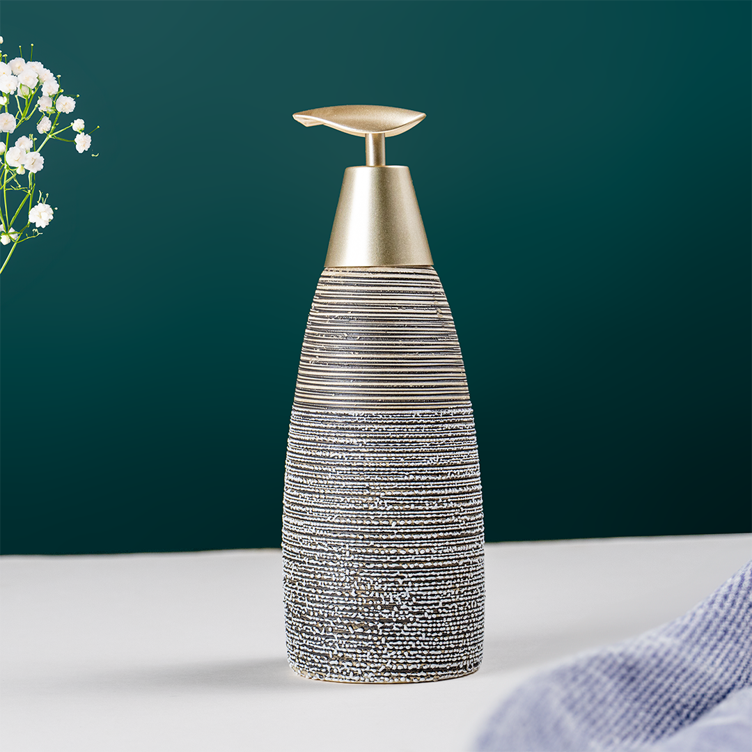 Add a sleek and sophisticated touch to your bathroom with this soap dispenser. Crafted from premium ceramic, each piece boasts a textured black finish accented with subtle gold highlights for a luxurious yet contemporary look. This coordinated set includes everything you need to keep your bathroom essentials organized while enhancing your décor.