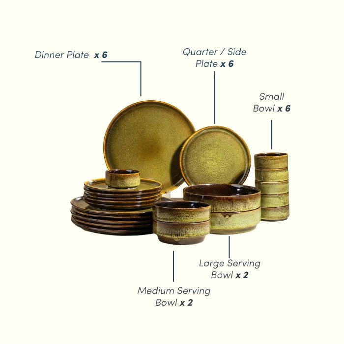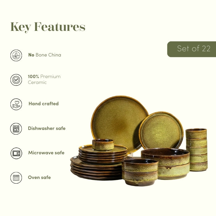 Upgrade your dining experience with this 22-Piece Ceramic Dinner Set for 6, beautifully finished in an earthy green reactive glaze with rich brown edging. The handcrafted dual-tone stoneware design adds a warm, modern-rustic touch, making it ideal for everyday meals, family gatherings, and special occasions.