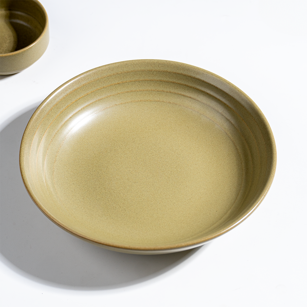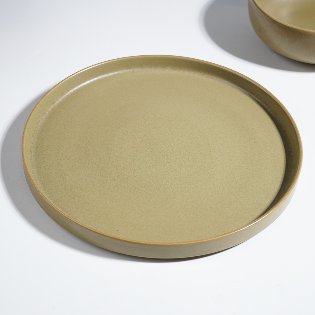 This olive green ceramic dinner set blends modern form with rustic warmth, making it suitable for a wide range of cuisines including Indian, Asian, and continental meals. The reactive glaze ensures every piece is unique, while the complete assortment allows you to serve, dine, and entertain with ease.