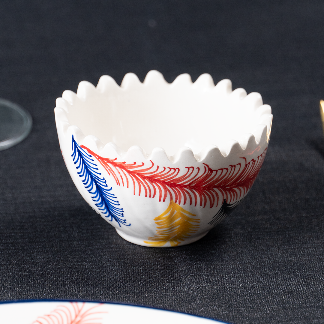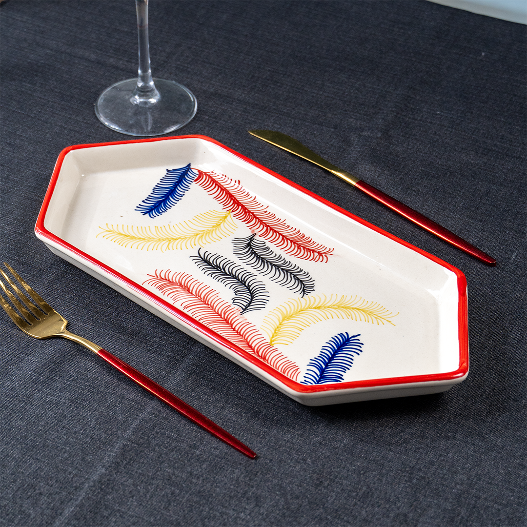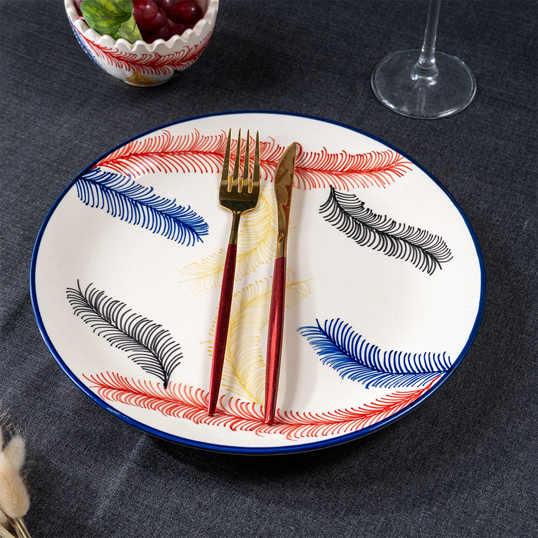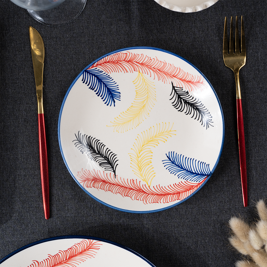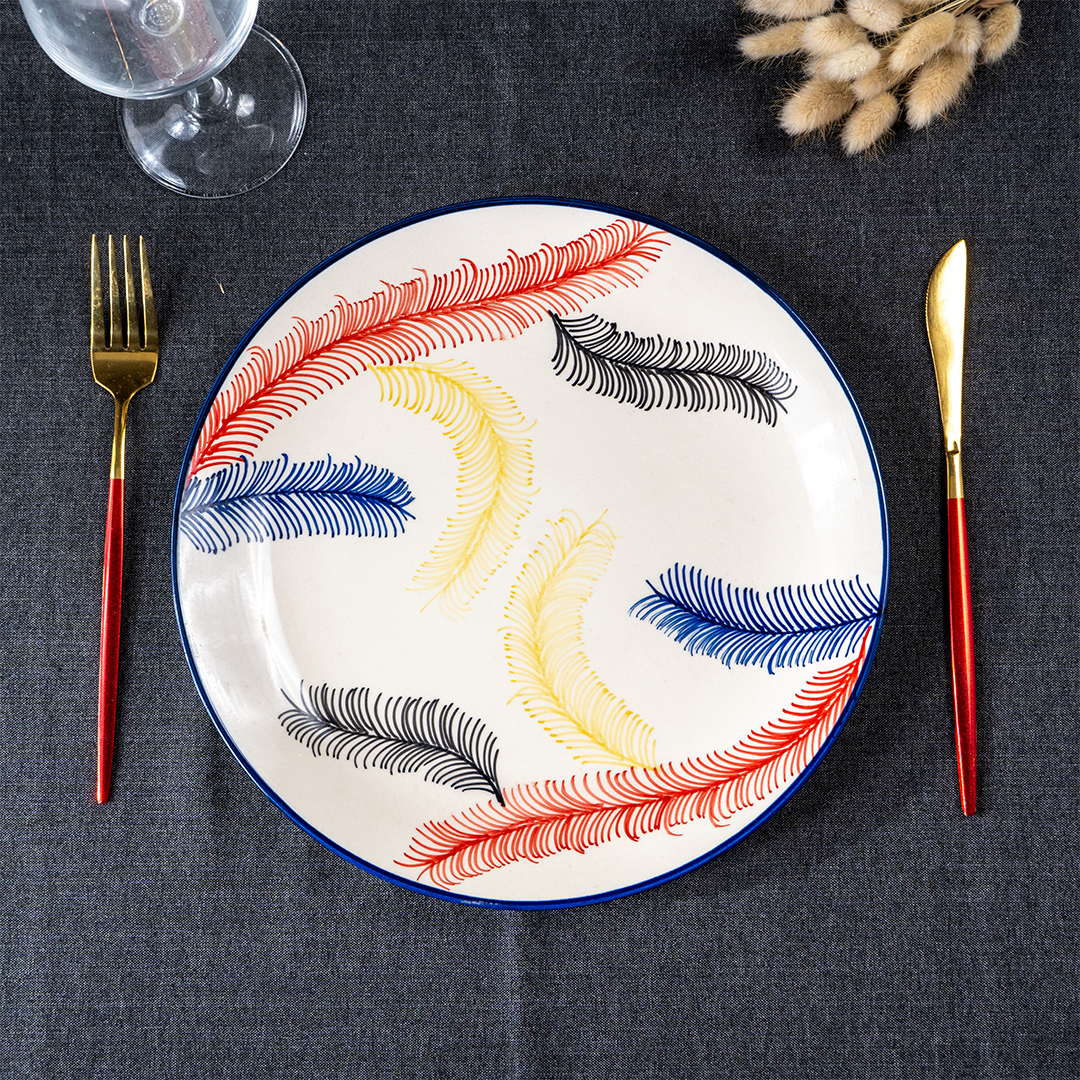 Add a splash of color and class to your dining table with this beautifully designed 19-piece multicolor ceramic dinner set. Featuring a feather-inspired pattern in vivid red, blue, yellow, and black, this set effortlessly combines artistic appeal with everyday durability. Whether it's a casual family dinner or a festive gathering, this set makes every meal feel special.