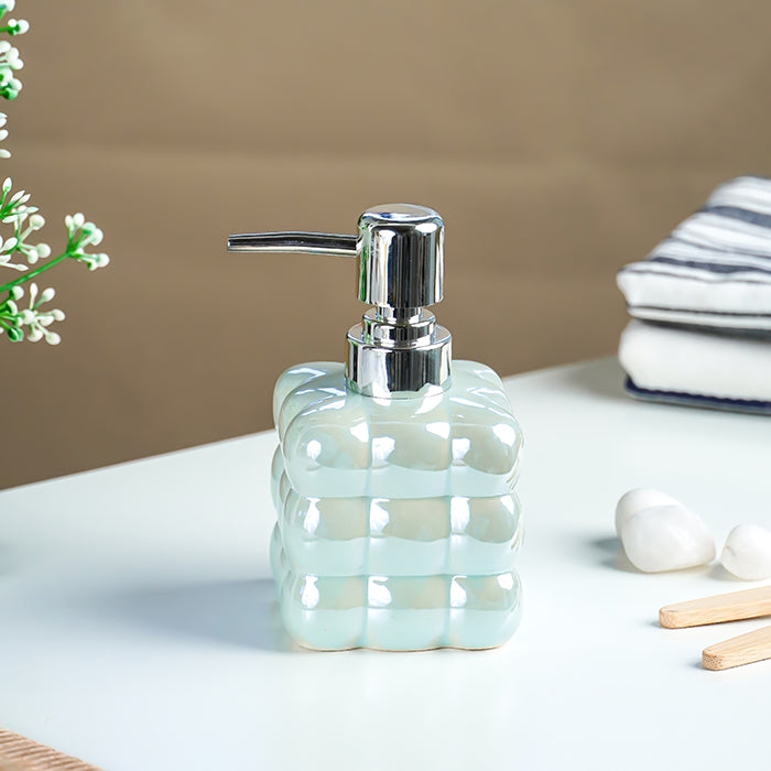 Upgrade your sink space with this pastel blue glossy ceramic soap dispenser, designed with a unique square bubble pattern reminiscent of soft, fluffy clouds. The smooth reflective finish enhances its modern appeal, while the chrome pump adds durability and ease of use. Perfect for bathrooms, kitchens, or office spaces, this dispenser combines functionality with a playful, sculptural aesthetic.