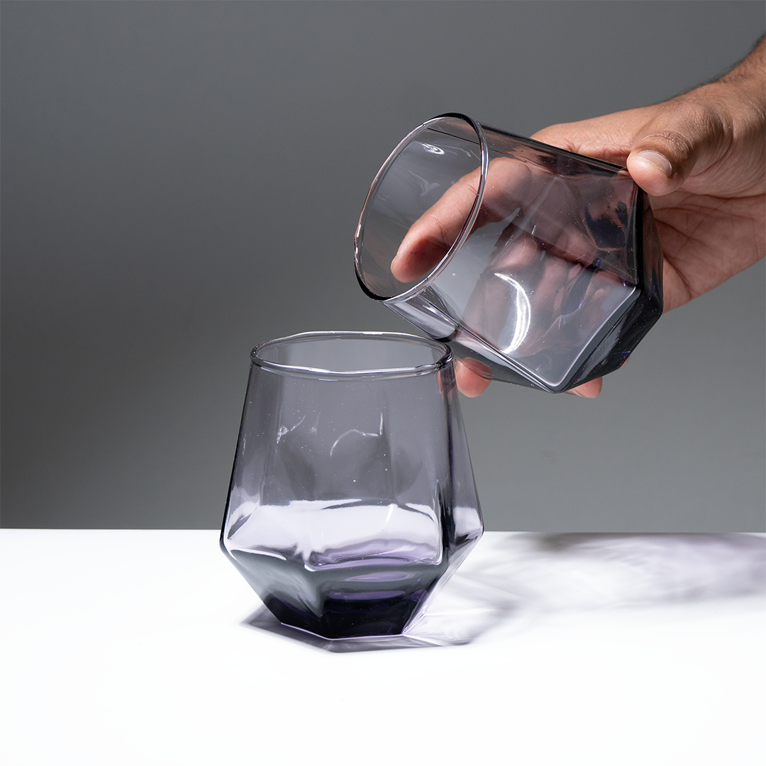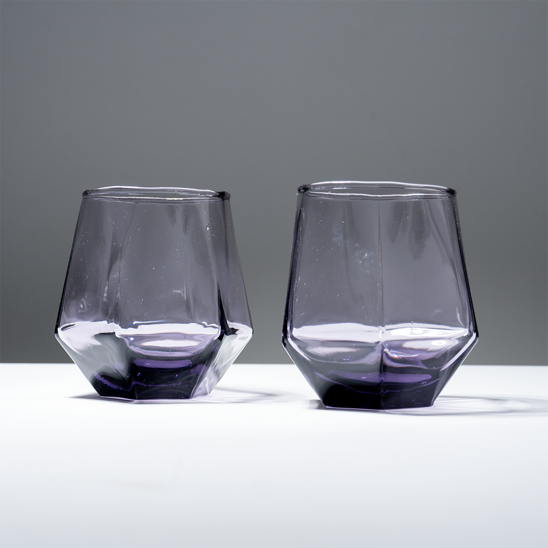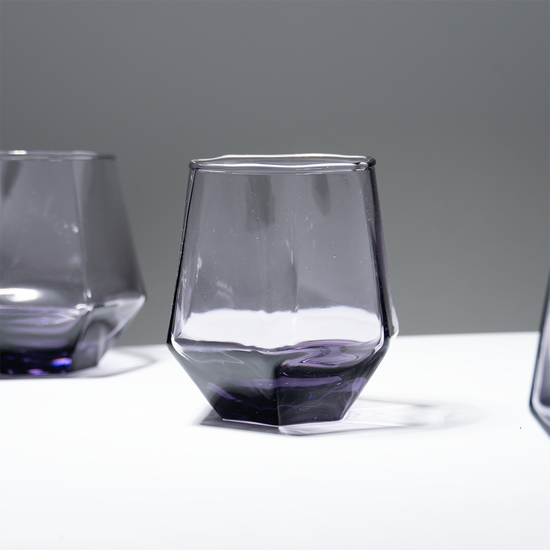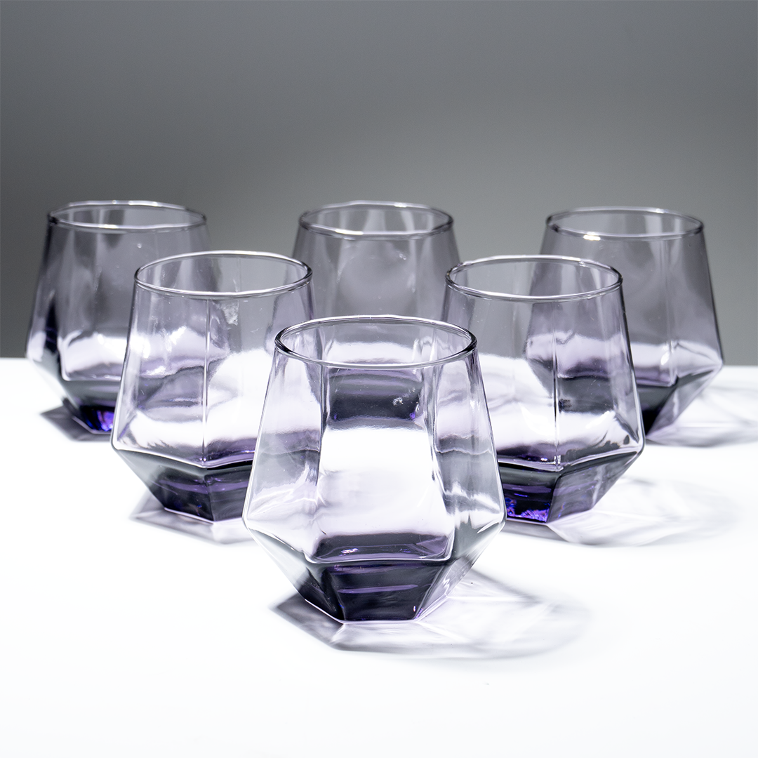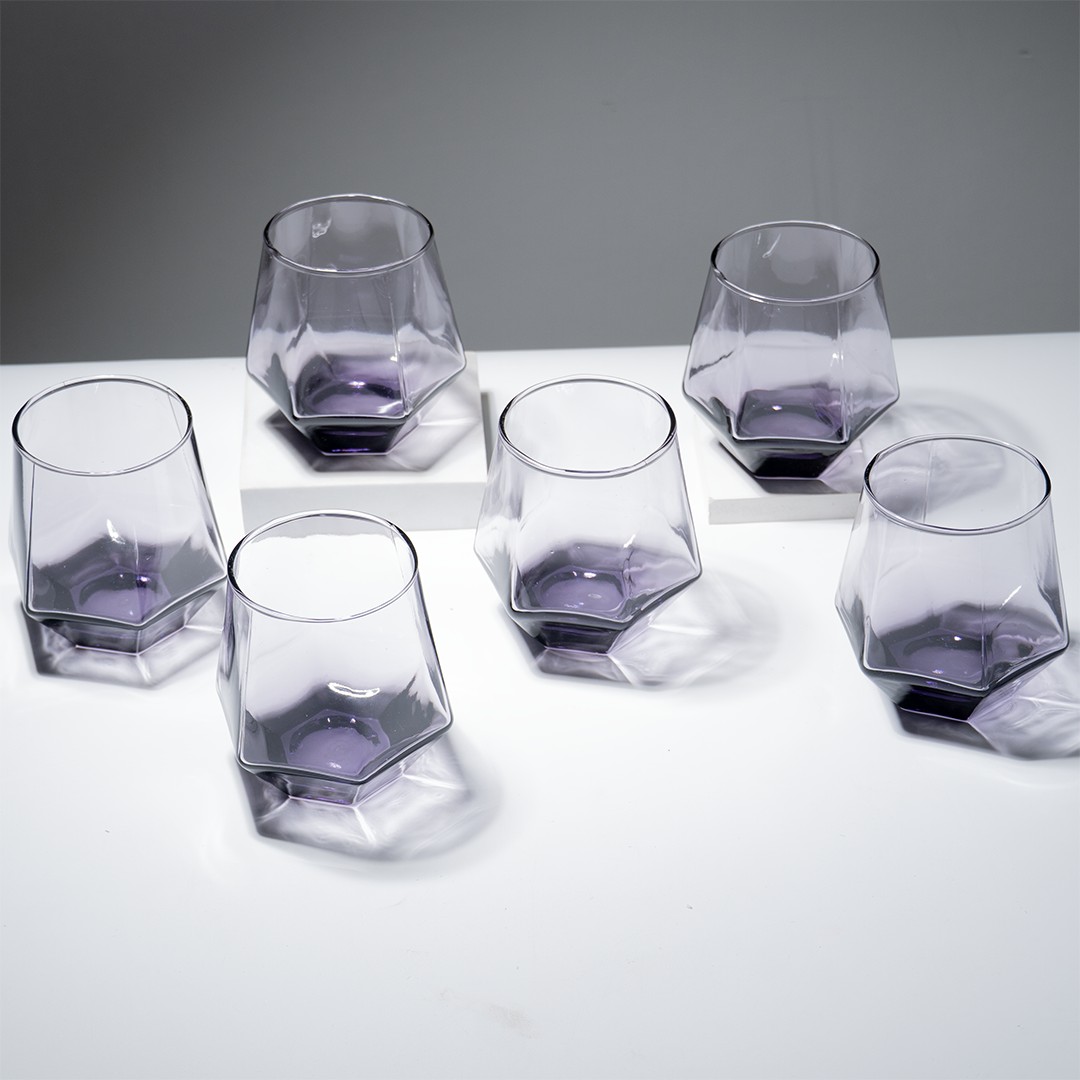 Upgrade your drinkware collection with this 6-piece purple modern geometric glass tumbler set, designed for a sleek, contemporary look. Each tumbler features a faceted, angular base that creates a sculptural silhouette, giving these glasses a premium, modern aesthetic. The soft lavender-purple tint adds subtle color without overpowering your table décor. Perfect for serving water, juice, cocktails, whiskey, mocktails, or everyday beverages.