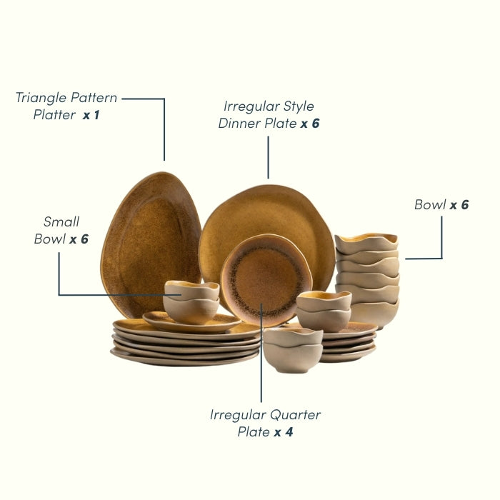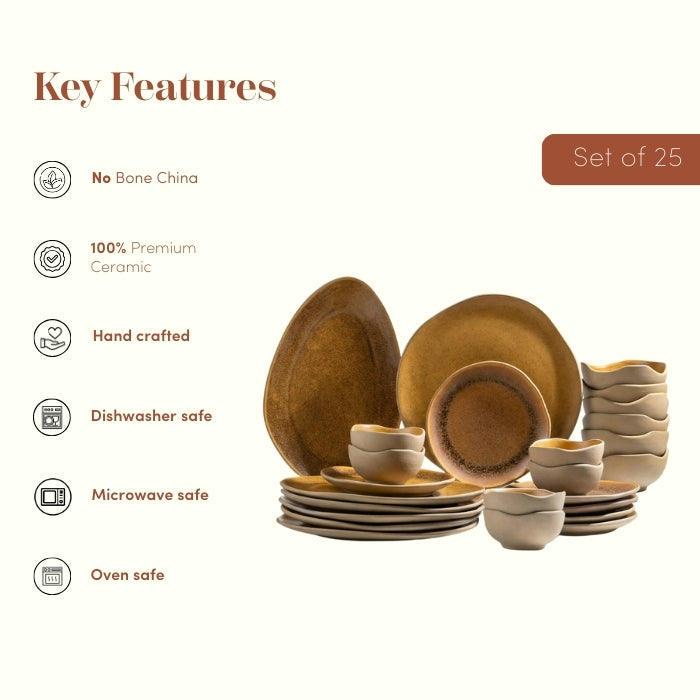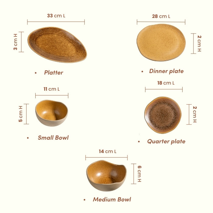 This ceramic dinner set brings together rustic warmth and contemporary design. The deep brown reactive glaze enhances food presentation, while the light beige bowls create a striking contrast. The irregular shapes add an organic, handmade feel that complements Indian, Asian, and continental cuisine beautifully.