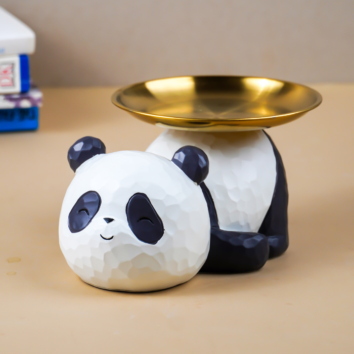 Keep your small essentials organized with this charming panda-shaped holder, featuring a stunning gold plated tray. Whether used as a jewelry holder for rings, earrings, or bracelets, or as a key tray for your entryway, this versatile piece offers a delightful blend of practicality and whimsical design. The black and white panda figure, with its textured finish and friendly expression, doubles as a decorative accent, making it a standout piece for your home or office.