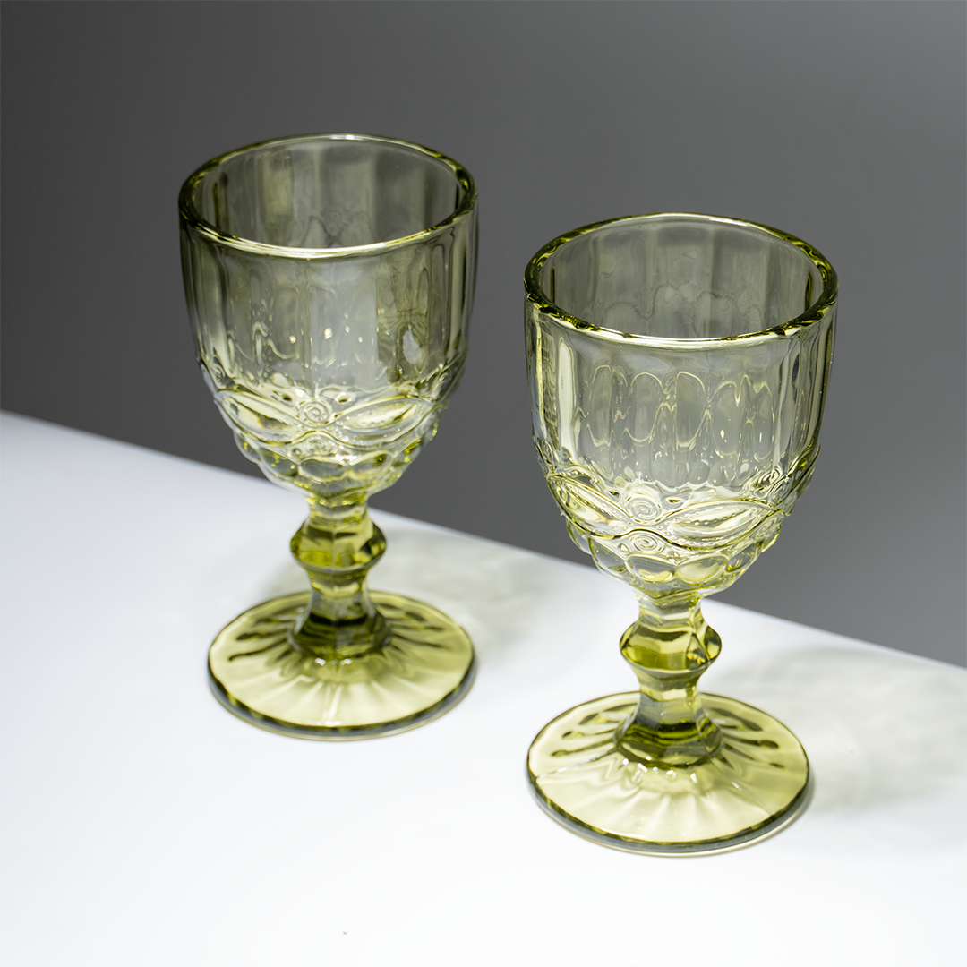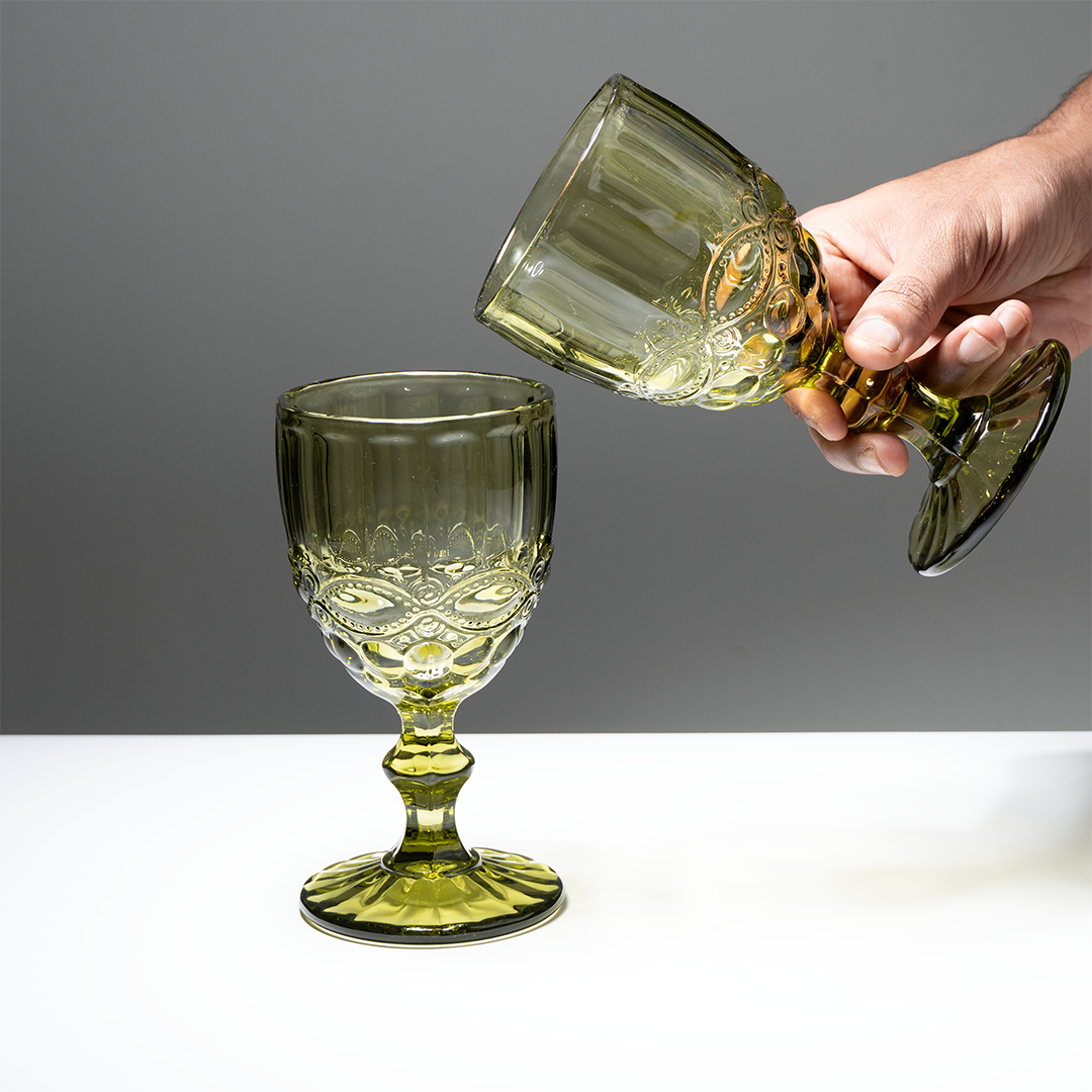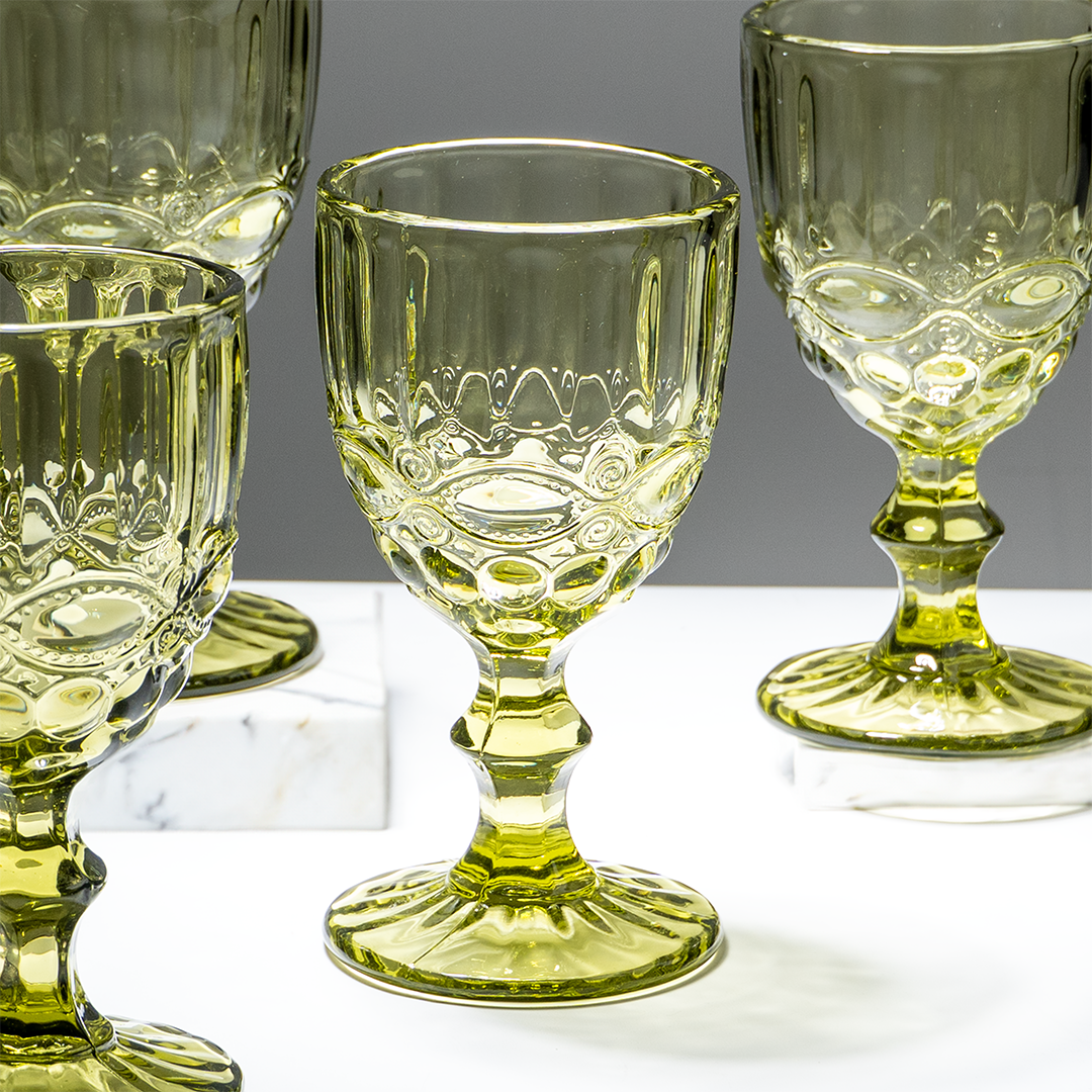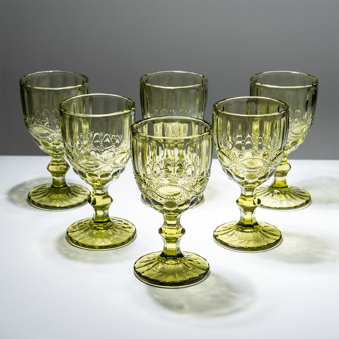 Introduce timeless charm to your table with this six-piece set of yellow embossed goblets, thoughtfully crafted to blend vintage elegance with everyday practicality. Each glass features an ornate raised pattern paired with a rich yellow tint that beautifully catches and reflects light. The sturdy stem and rounded bowl make these goblets perfect for serving wine, cocktails, juices, or sparkling beverages with a touch of sophistication.
