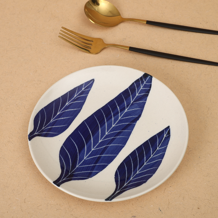 Whether you're hosting a formal dinner party or enjoying a casual meal with family, our White Base Quarter Plate with Blue Leaf Design adds a touch of refined style to your dining experience. Elevate your culinary presentations and create a memorable dining ambiance with this exquisite quarter plate, where aesthetics meet practicality in perfect harmony.
