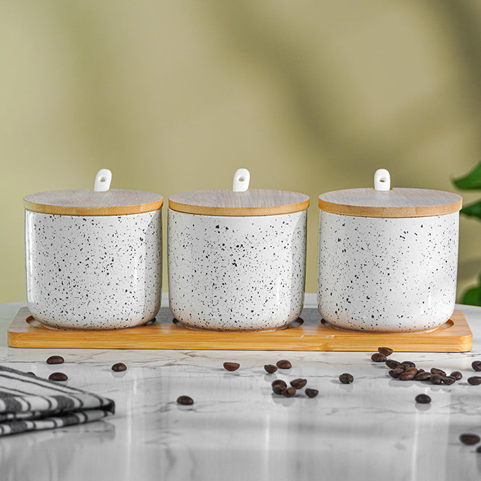Upgrade your kitchen storage with this speckled white ceramic canister set, featuring a natural bamboo lid and matching tray for an organized and stylish countertop. Designed with an airtight seal, these canisters keep your coffee, tea, sugar, and dry goods fresh while adding a modern rustic charm to your space. The speckled glaze gives each piece a unique, handcrafted touch, making it both functional and decorative.