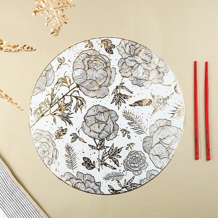 Transform your dining setup with this white and gold floral table mat, featuring an intricate botanical illustration with metallic accents. The round design provides a unique aesthetic, complementing both casual and formal table settings. Made from durable, heat-resistant material, this table mat not only protects surfaces but also enhances your décor with its nature-inspired artistry.