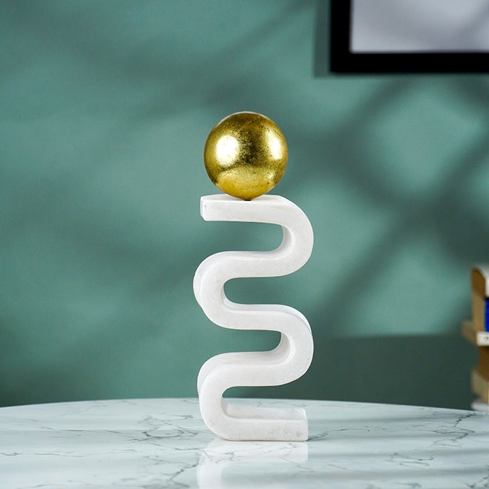 Make a bold artistic statement with this white marble-finish zigzag sculpture, featuring a striking gold sphere balanced on top. Crafted from durable resin, this abstract decor piece adds movement and sophistication to any space. Its wavy structure and metallic contrast make it a captivating centerpiece for modern interiors. Whether placed on a console table, office desk, or bookshelf, it effortlessly enhances contemporary and minimalistic aesthetics.